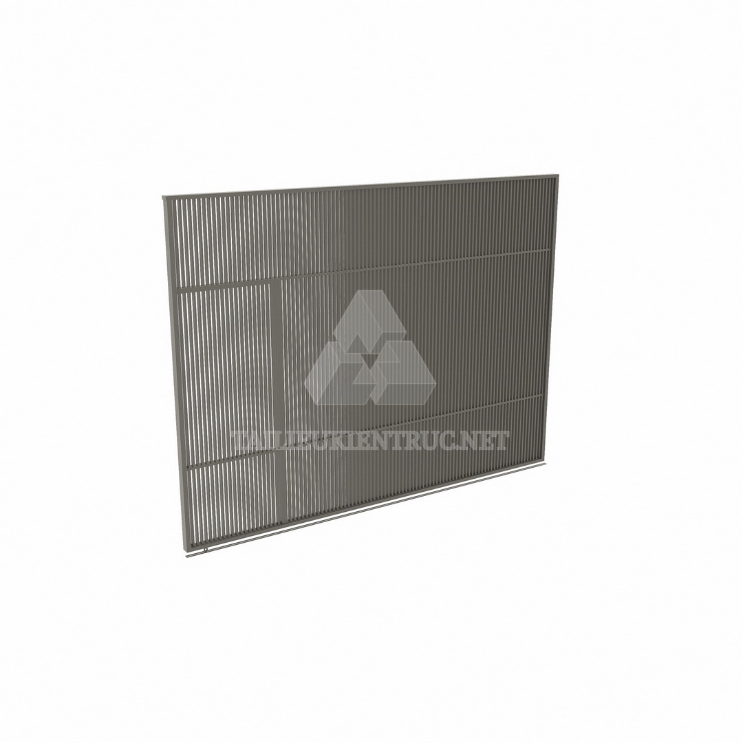 Hình ảnh cho thấy một thiết kế vách ngăn kim loại với các thanh dọc song song tạo cảm giác hiện đại và tối giản. Sự sắp xếp hợp lý của các thanh kim loại không chỉ tạo điểm nhấn thẩm mỹ mà còn đảm bảo độ bền chắc của sản phẩm.