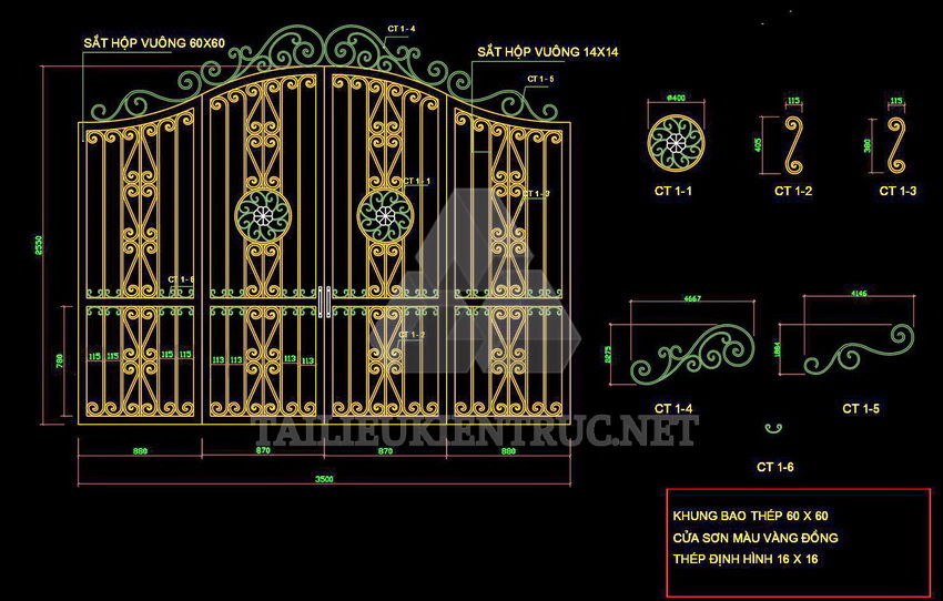 Bản vẽ hiển thị một thiết kế cổng tường rào với các chi tiết cụ thể về cấu trúc và trang trí. Hình ảnh đầu tiên cho thấy một cổng lớn với các mẫu hoa văn tinh tế, sử dụng chất liệu sắt hộp có kích thước 60x60 và 14x14. Màu sơn vàng đồng tạo nên vẻ ngoài sang trọng và bắt mắt. Các yếu tố hoa văn được thiết kế độc đáo, tạo điểm nhấn mạnh mẽ cho tổng thể công trình.