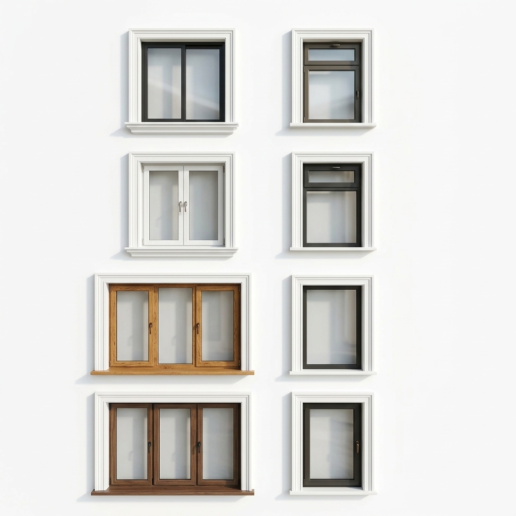 Hình ảnh thứ hai trình bày một loạt cửa sổ với nhiều kiểu dáng và chất liệu khác nhau, từ kim loại đến gỗ, với khung cửa sổ màu trắng làm nổi bật từng thiết kế riêng biệt. Đây là một bộ sưu tập phong phú cho thấy sự linh hoạt trong thiết kế kiến trúc hiện đại.