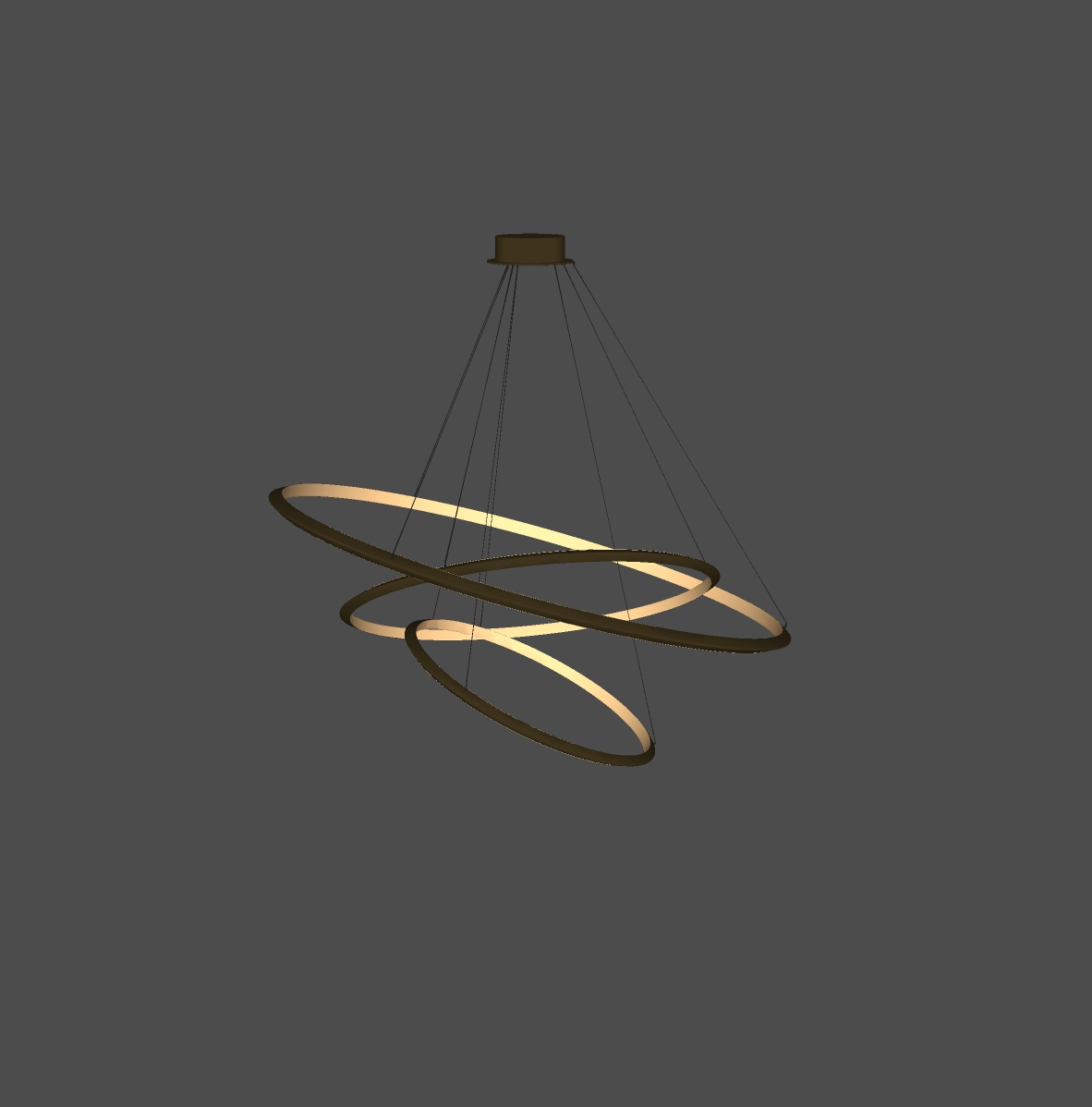 Hình ảnh cho thấy thiết kế của một đèn trần với các vòng xoắn hiện đại và tinh tế. Sản phẩm có một cấu trúc ba vòng sáng bằng kim loại với ánh đèn LED dịu nhẹ, tạo nên một không gian ánh sáng hài hòa và ấm cúng. Đèn được treo bằng các dây kim loại mảnh, giúp tạo cảm giác như vòng tròn đang lơ lửng trong không khí.