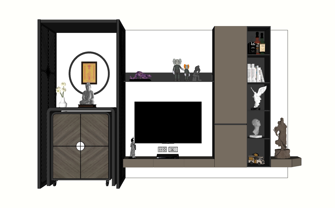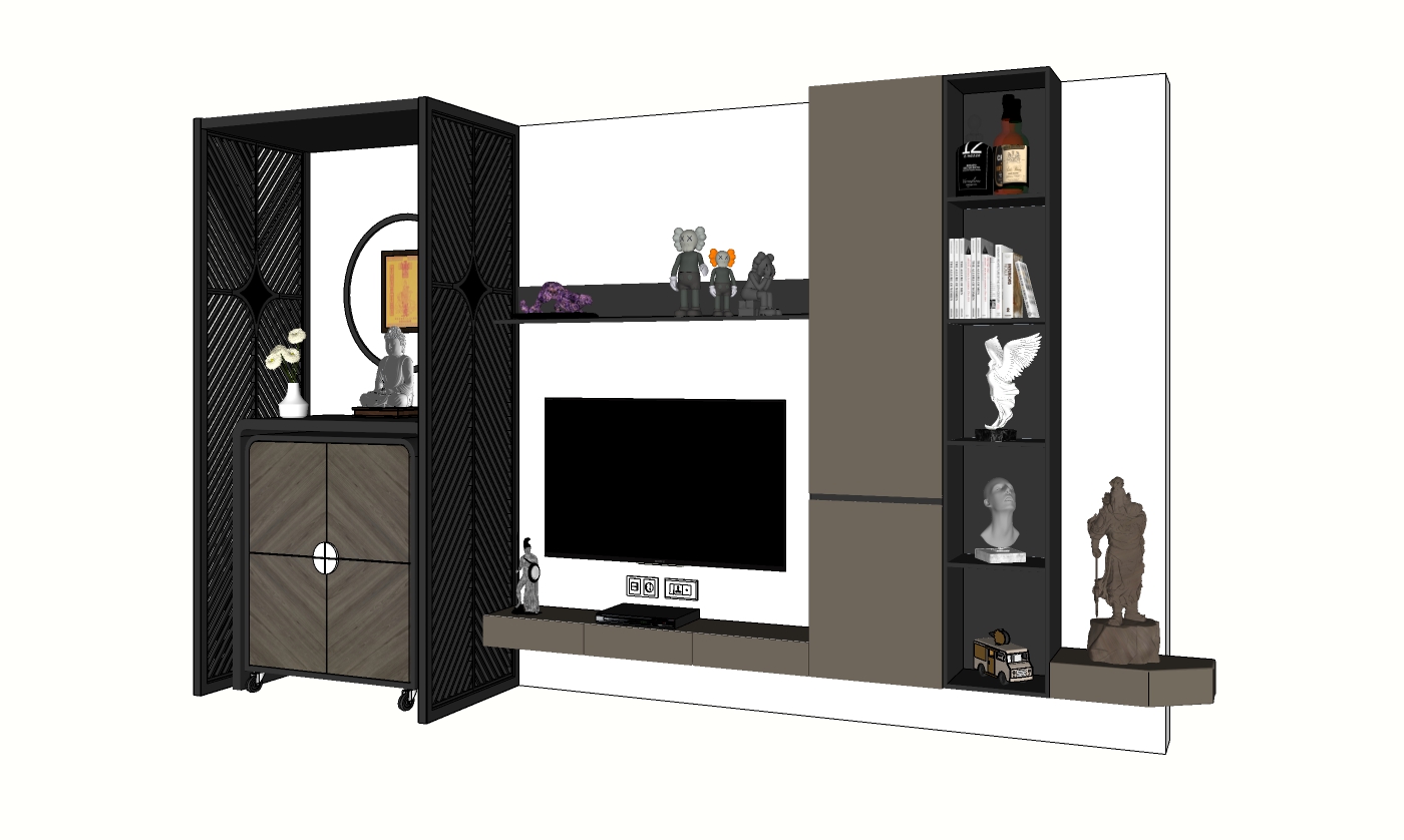 Bộ kệ này được thiết kế với sự kết hợp của nhiều ngăn tủ, kệ mở và khu vực đặt TV, tạo nên một không gian gọn gàng và thống nhất. Phần gỗ tối màu được kết hợp với khung kim loại sơn đen, tạo nên vẻ ngoài mạnh mẽ và hiện đại. Các bức tượng nhỏ và sách được bài trí một cách cẩn thận tô điểm cho không gian, tạo nên sự phong phú và sinh động.