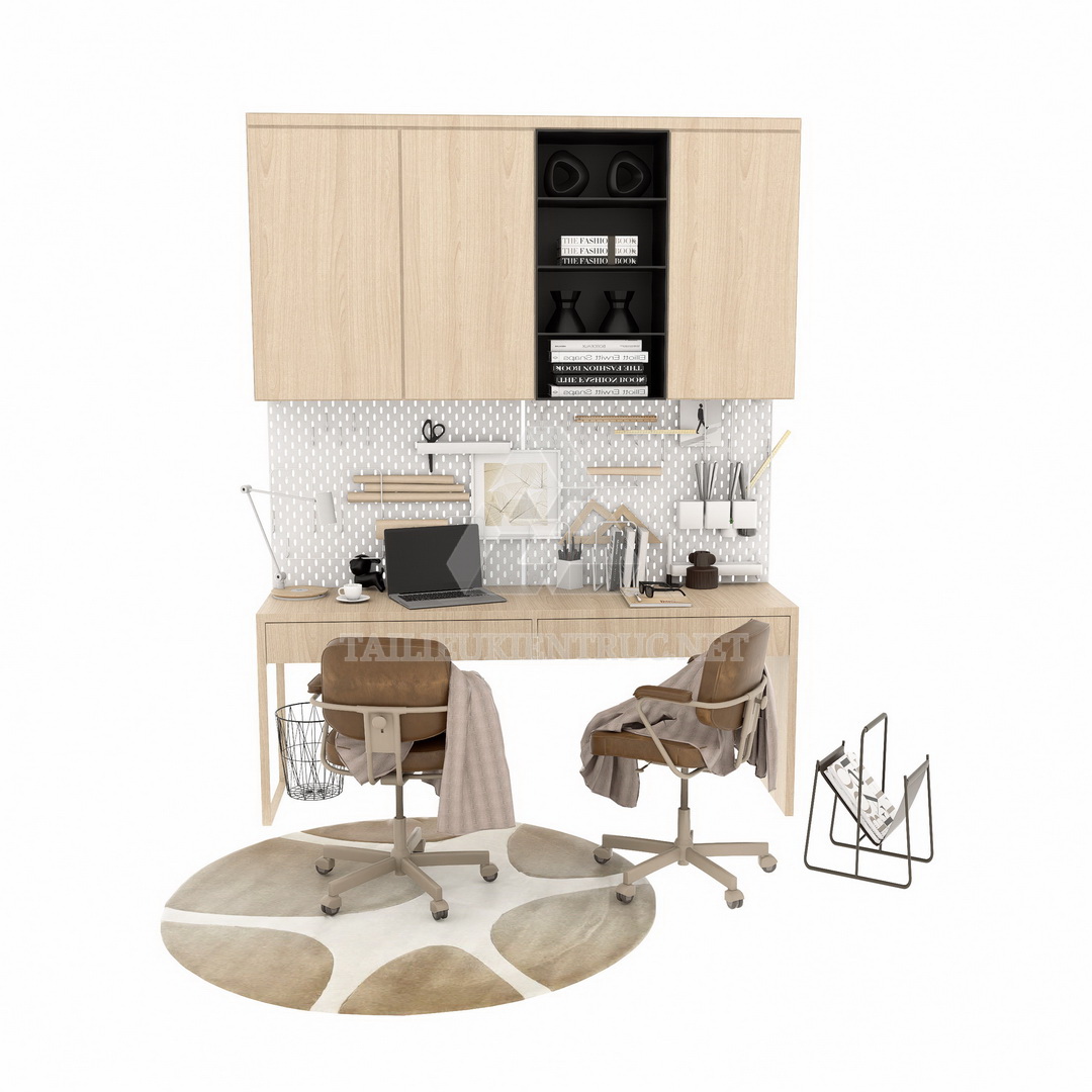 Bộ hình ảnh này mô tả một không gian làm việc tích hợp, gồm bàn làm việc và các phụ kiện đi kèm. Điểm nổi bật là mọi chi tiết đều được sắp xếp một cách khoa học, giúp tối ưu hóa diện tích và tạo môi trường làm việc hiệu quả.