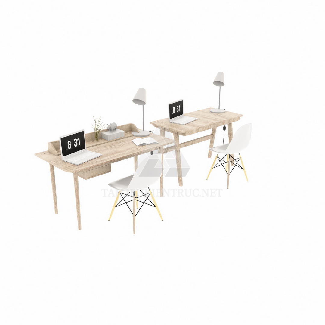 Các hình ảnh hiển thị hai bộ bàn làm việc đơn giản nhưng hiện đại. Bàn được làm từ vật liệu gỗ sáng màu, tạo cảm giác thoải mái và tự nhiên. Trên mặt bàn, có thể thấy các vật dụng đắt giá như laptop, đèn bàn, và chút ít trang trí thêm phần sinh động như cây xanh nhỏ.