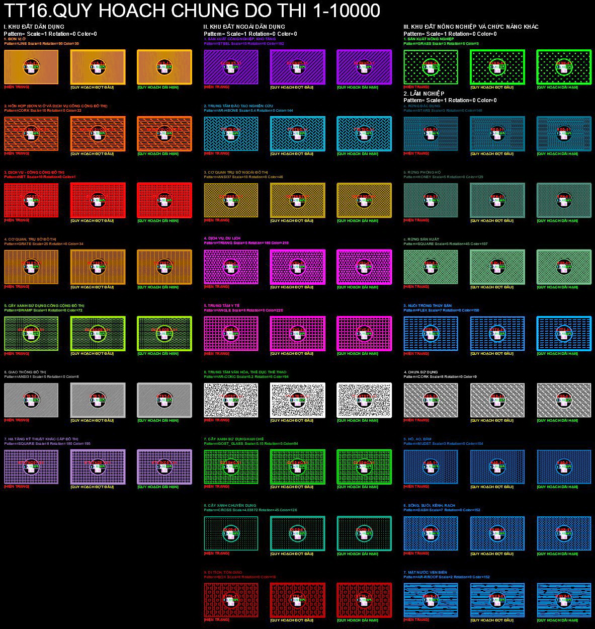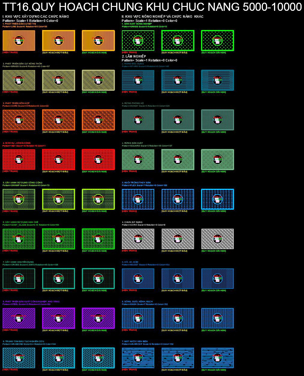 Hình ảnh giới thiệu bộ sưu tập mẫu hatch khác nhau thể hiện các kiểu quy hoạch chung đô thị với tỷ lệ 1:10000 và 1:5000. Các mẫu hatch này được thiết kế với màu sắc và họa tiết đa dạng, giúp phân định rõ ràng các khu vực như khu đất dân dụng, khu đất ngoại ô, khu đất nông nghiệp, công nghiệp và chức năng khác.