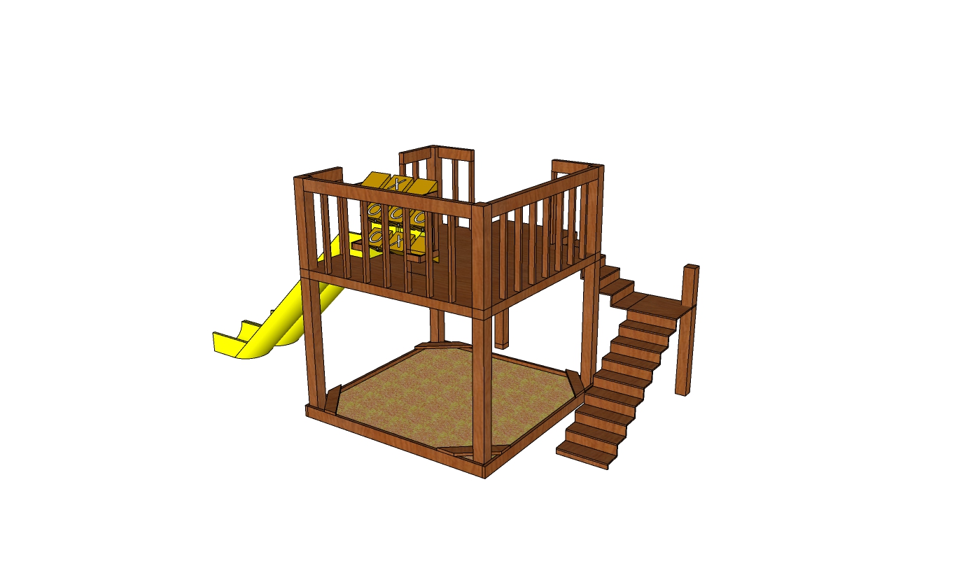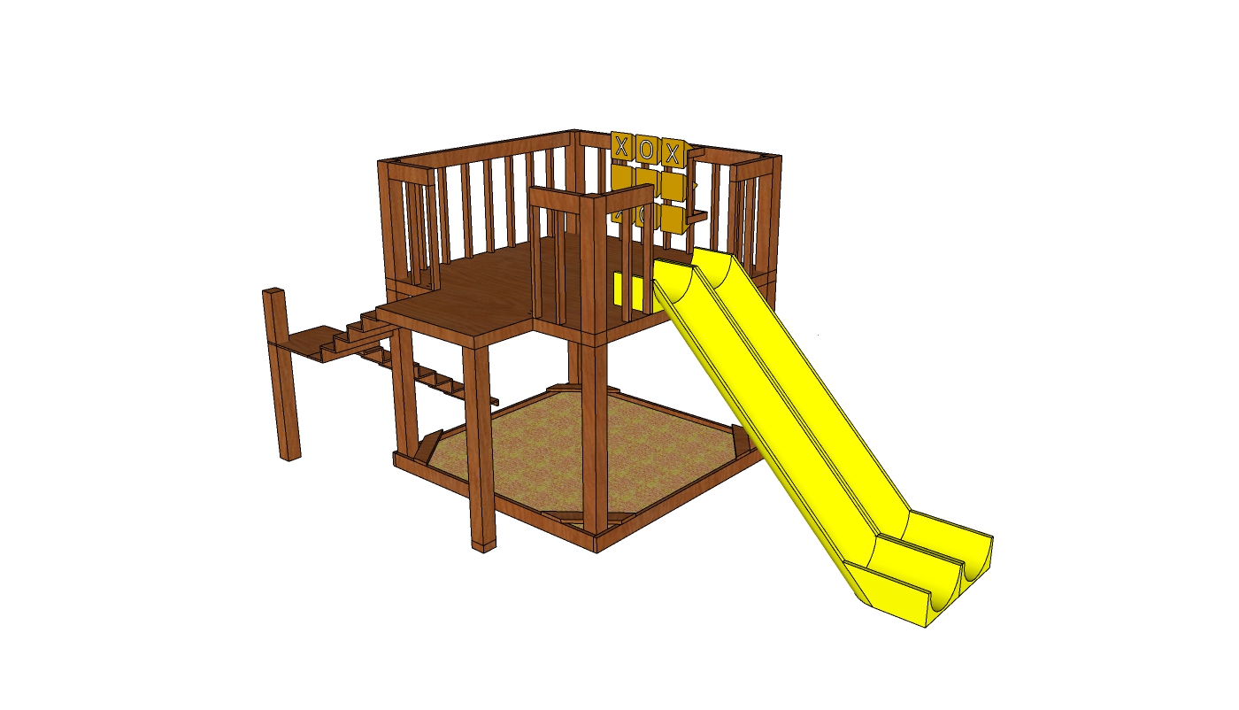 Mô hình 3D này là bản mô phỏng chi tiết của một khu vui chơi đơn giản dành cho trẻ em với hình dáng trực quan và dễ sử dụng. Các hình ảnh thể hiện một cấu trúc gỗ cao, bao gồm cầu thang, sàn gỗ và một cầu trượt màu vàng nổi bật. Kết hợp với đó là một khu vực chơi cát ở bên dưới, tạo nên không gian vui chơi đa chức năng cho trẻ.