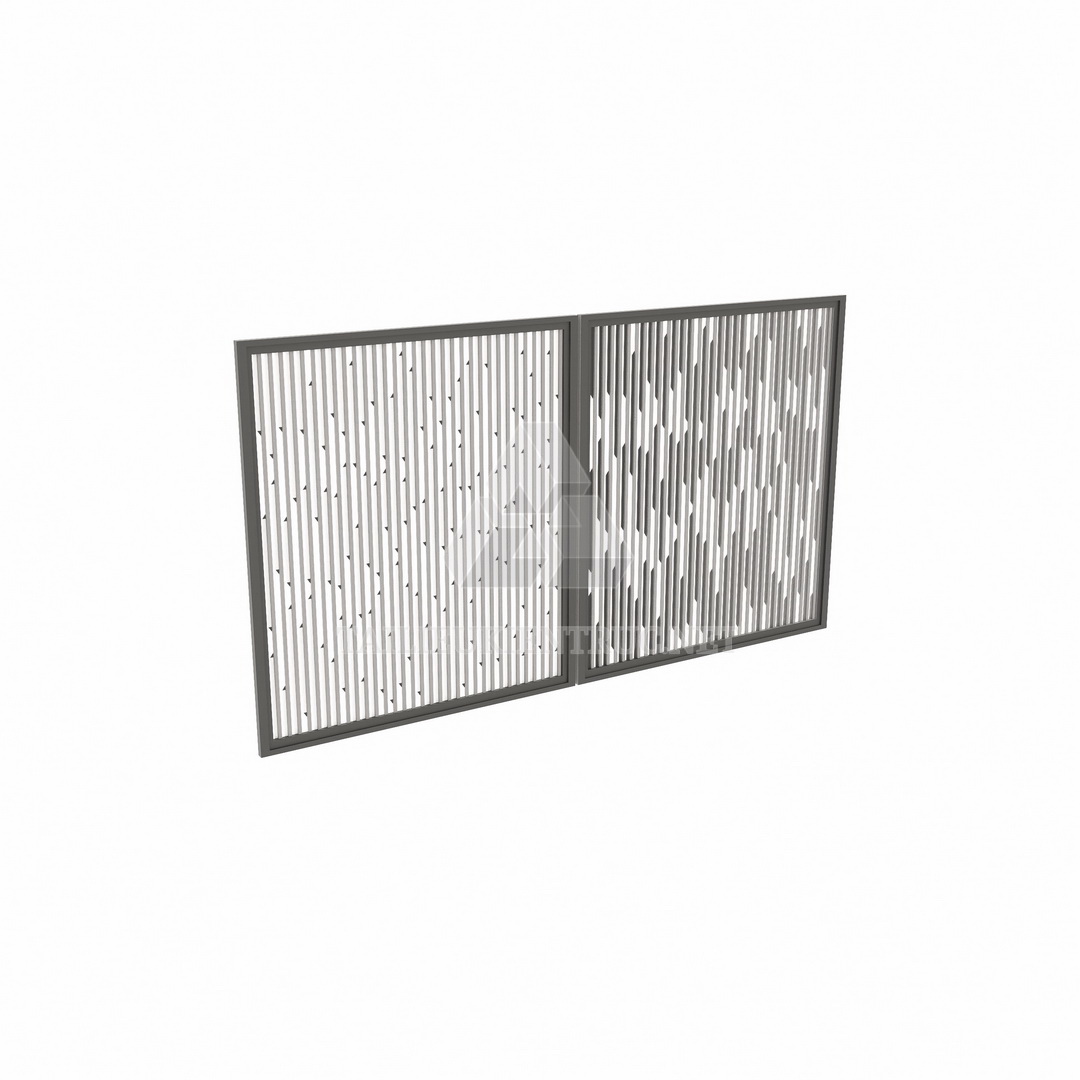 Trong hình ảnh trên, ta có thể thấy bức vách gồm hai tấm ghép lại với hoa văn sọc ngang độc đáo. Thiết kế sử dụng những đường thẳng song song tạo hiệu ứng thị giác khác biệt, đồng thời mang đến nét đẹp tinh tế và hiện đại. Tông màu chủ đạo là trắng và xám, tạo cảm giác thanh lịch và dễ phối với các phong cách nội thất khác nhau.