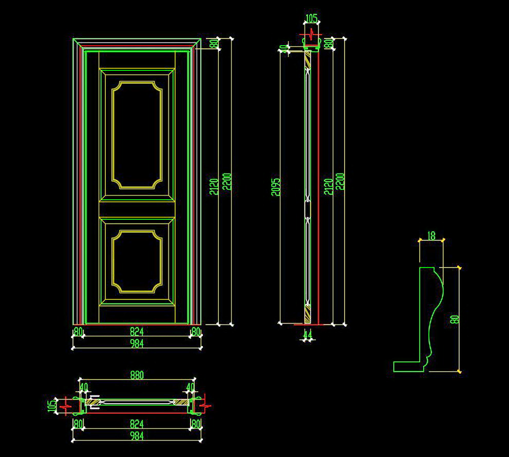 Hình ảnh đầu tiên hiển thị bản vẽ kỹ thuật của một cánh cửa gỗ hai panel, bao gồm các kích thước chi tiết cho từng phần của cửa. Hình ảnh thứ hai cung cấp một bản vẽ CAD với các đường nét và kích thước được thể hiện rõ ràng trên nền đen để dễ dàng nhận diện.