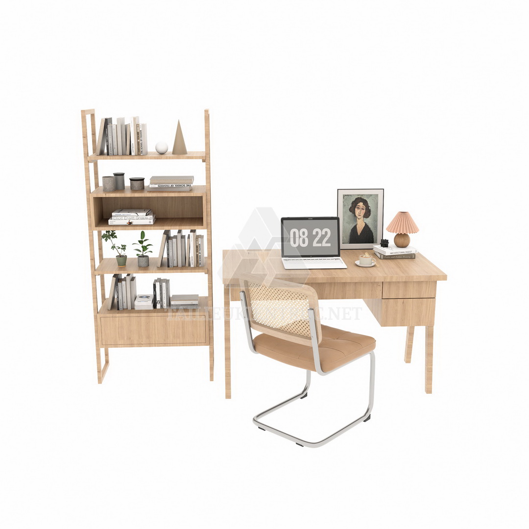 Bộ bàn ghế này nổi bật nhờ thiết kế bằng chất liệu gỗ tự nhiên, kết hợp với nét thanh lịch và tối giản, tạo ra một góc làm việc không chỉ tiện dụng mà còn thẩm mỹ.