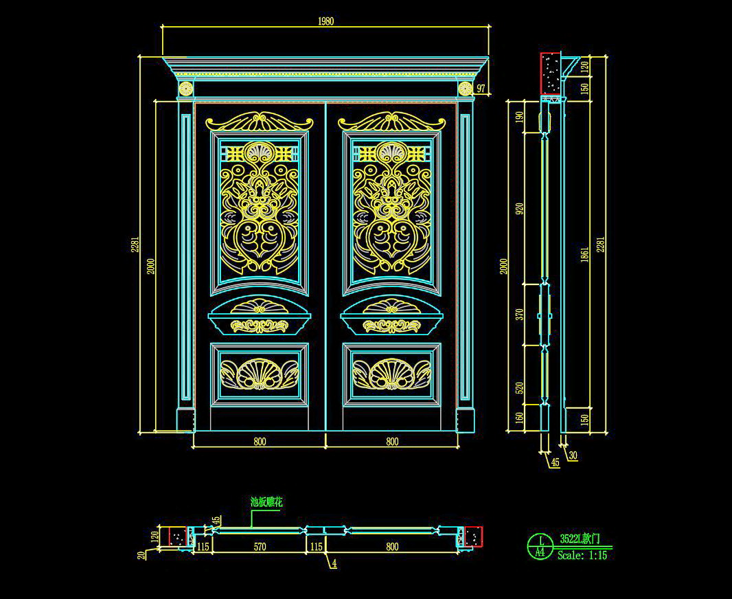 Bản vẽ cho thấy một thiết kế cửa hai cánh với các họa tiết hoa văn tinh xảo, tạo nên sự hòa hợp giữa vẻ đẹp hiện đại và cổ điển. Kích thước tổng thể của cửa là 1980mm x 3000mm, một kích thước phổ biến cho các công trình xây dựng lớn. Bản vẽ bao gồm mặt cắt chi tiết giúp người xem dễ dàng hiểu được cấu tạo và cách lắp ghép.
