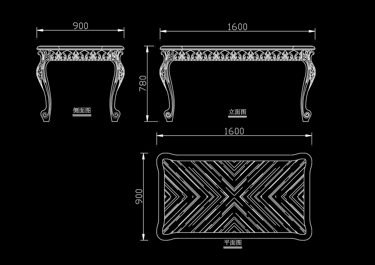 Trong bản vẽ, chiếc bàn hiện lên với một phong cách cổ điển và sang trọng, nhấn mạnh vào các hoa văn và đường cong được thiết kế tỉ mỉ. Hình ảnh thể hiện các góc nhìn khác nhau của chiếc bàn, bao gồm mặt đứng, mặt phẳng bên trên và mặt bên, giúp người xem có cái nhìn toàn diện về sản phẩm này.