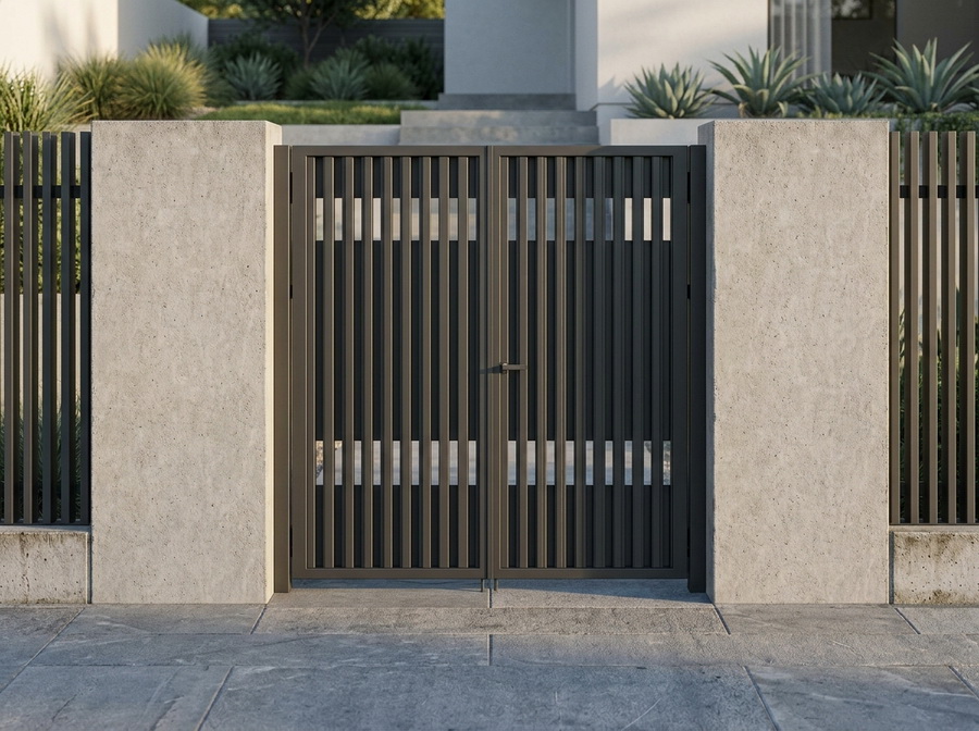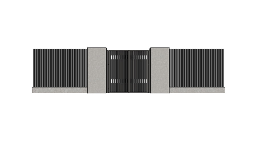 Mô hình cổng trong hình ảnh bao gồm thiết kế tối giản với các thanh dọc, kết hợp hoàn hảo giữa khung kim loại và tường xi măng, tạo cảm giác an toàn nhưng không kém phần tinh tế. Cổng này phù hợp cho nhiều kiểu kiến trúc, từ hiện đại đến cổ điển, nhờ vào màu sắc trung tính và thiết kế đơn giản nhưng sang trọng.
