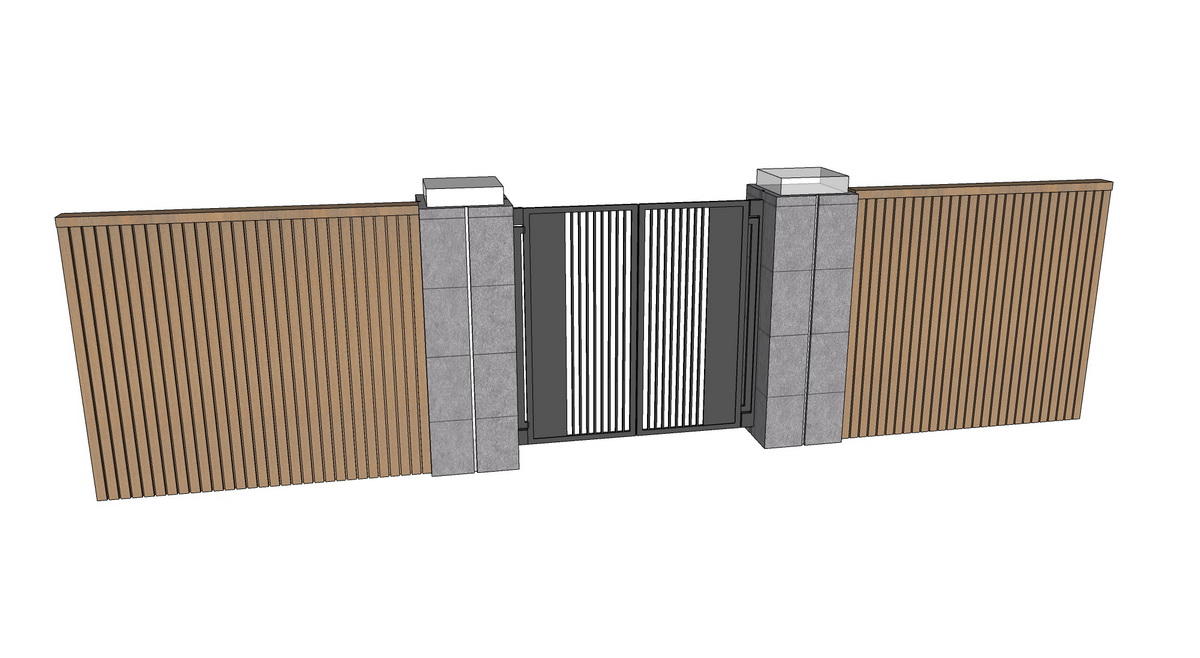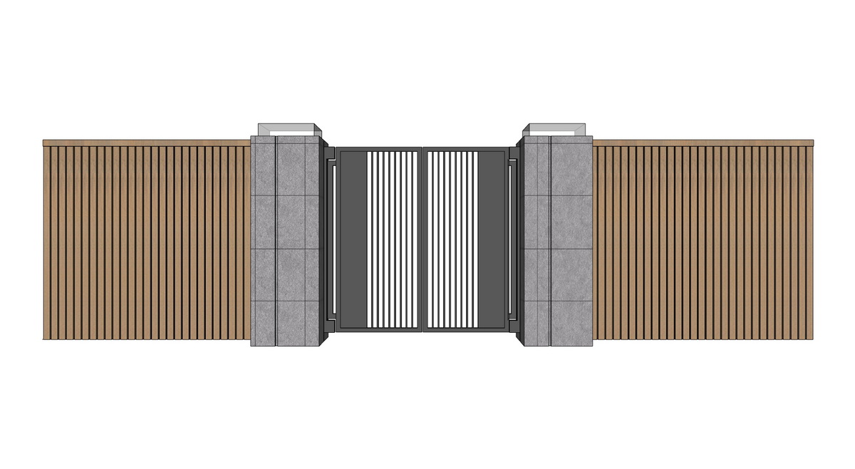 Mẫu cổng trong hình ảnh được thiết kế với phong cách tối giản nhưng vẫn đảm bảo vẻ đẹp thẩm mỹ. Cổng có khung kim loại chắc chắn kết hợp với các thanh ngang tạo điểm nhấn độc đáo. Hai bên là tường gỗ thẳng đứng, tạo cảm giác ấm cúng và gần gũi với thiên nhiên.