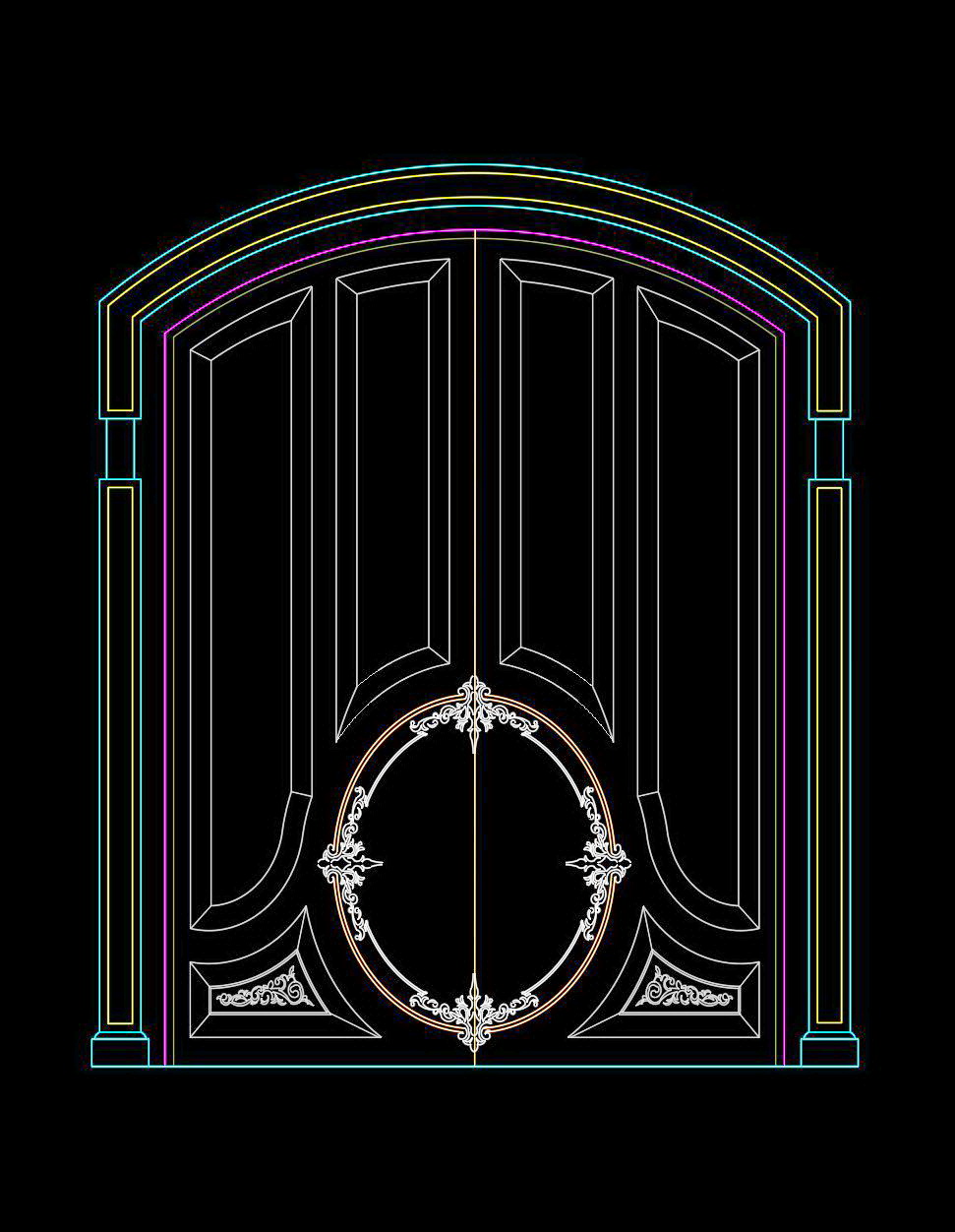 Hình ảnh thứ hai thể hiện phiên bản đa màu sắc trên nền đen, giúp làm nổi bật các đường nét thiết kế. Màu sắc được phối hợp tinh tế, tạo sự nổi bật cho phần vòm và các chi tiết hoa văn, giúp các kiến trúc sư dễ dàng nhận diện các yếu tố quan trọng trong thiết kế.