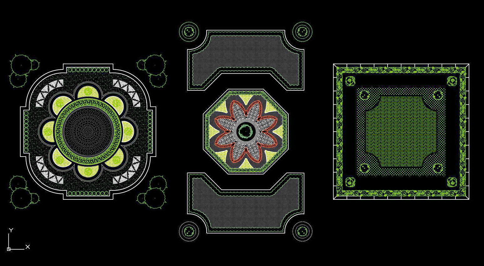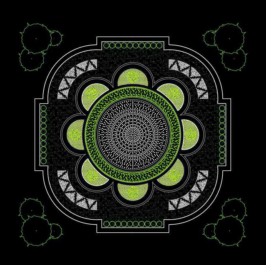Các hình ảnh minh họa trong tài liệu này thể hiện hai mẫu hoa văn đa dạng với độ phức tạp và tinh tế, phù hợp cho việc ứng dụng trong các dự án kiến trúc hiện đại cũng như cổ điển. Hình đầu tiên là sự kết hợp hài hòa của các hoa văn hình học và thực vật, tạo nên một điểm nhấn ấn tượng trên nền đen. Hình thứ hai nhấn mạnh vào sự cân đối và hài hòa với đường viền sắc nét và hoa văn trang trí ở bốn góc, mang lại cảm giác cổ điển và sang trọng.