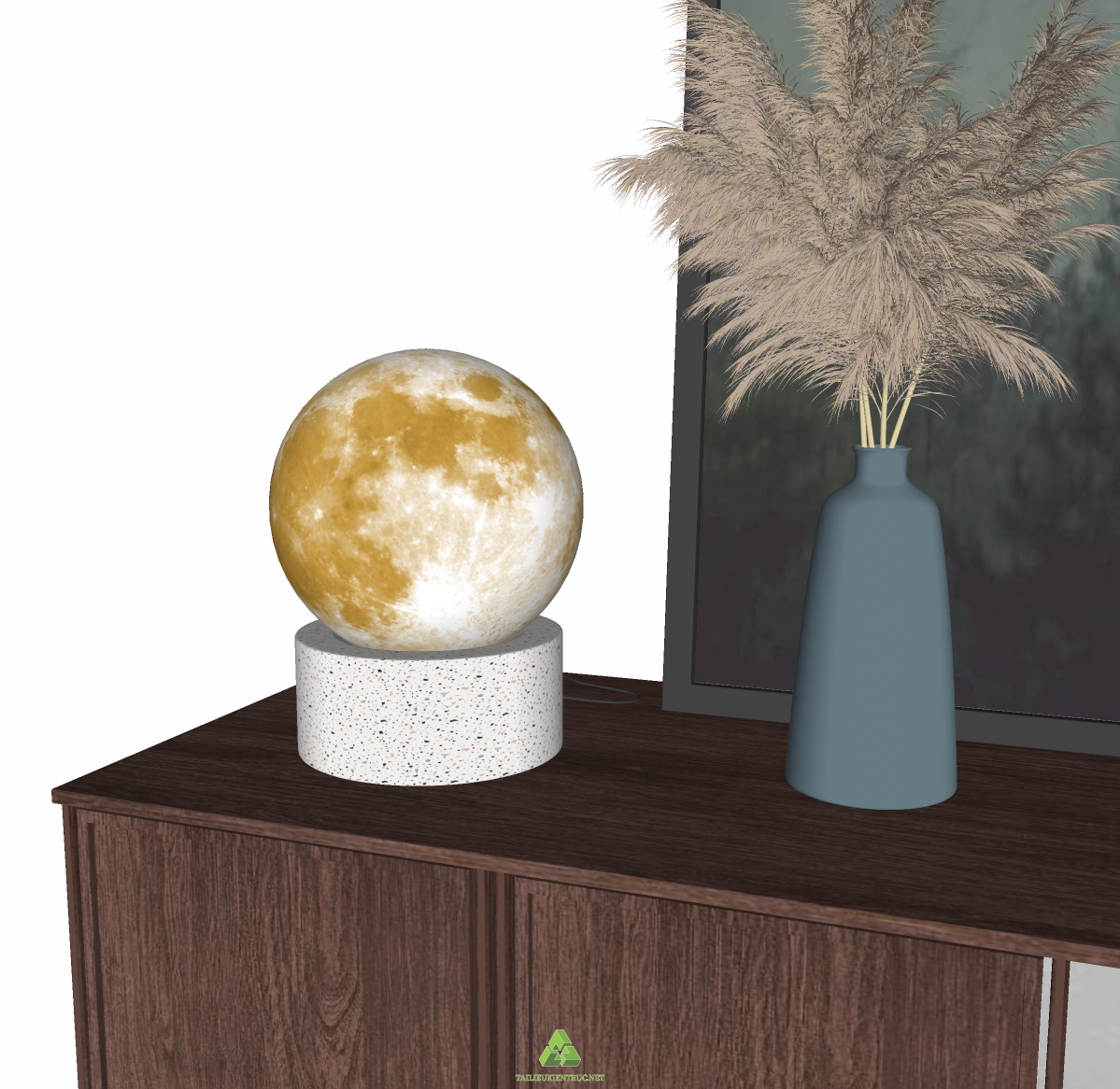 Hình ảnh hiển thị một góc bàn được trang trí với một đèn bàn hình mặt trăng và một bình hoa xinh xắn, tạo nên một không gian trang nhã và ấm cúng. Đèn bàn có thiết kế độc đáo với phần cầu hình mặt trăng đặt trên đế terrazzo màu trắng, mang lại vẻ đẹp hiện đại và sang trọng. Bình hoa bên cạnh làm từ gốm màu xanh đậm, chứa những bông lau mềm mại, tạo nên sự hài hòa về màu sắc và bố cục.