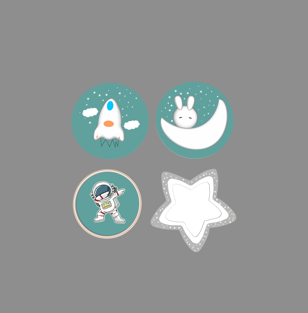 Bộ đèn LED này gồm bốn hình dạng khác nhau: một chiếc tàu vũ trụ, một chú thỏ trên mặt trăng, một phi hành gia và một ngôi sao. Mỗi chiếc đèn mang một chủ đề không gian, giúp khơi dậy trí tưởng tượng của trẻ em.