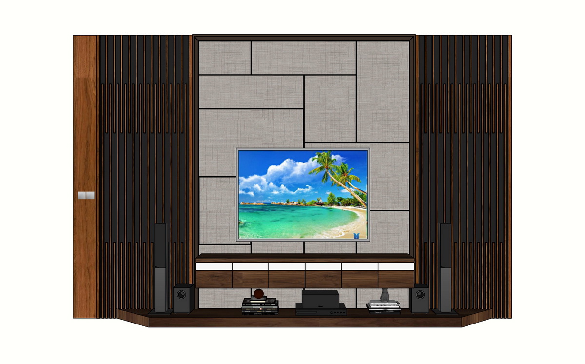 Hình ảnh trên đây mô tả một kệ tivi sang trọng với phong cách hiện đại. Chính điện là một màn hình tivi lớn, xung quanh là vách ngăn được bao phủ bởi các tấm gỗ xẻ sọc dọc tinh tế. Chúng tạo nên một không gian hài hòa và hiện đại. Màu sắc chủ đạo của thiết kế là nâu gỗ và trắng, mang lại cảm giác ấm cúng và sang trọng.