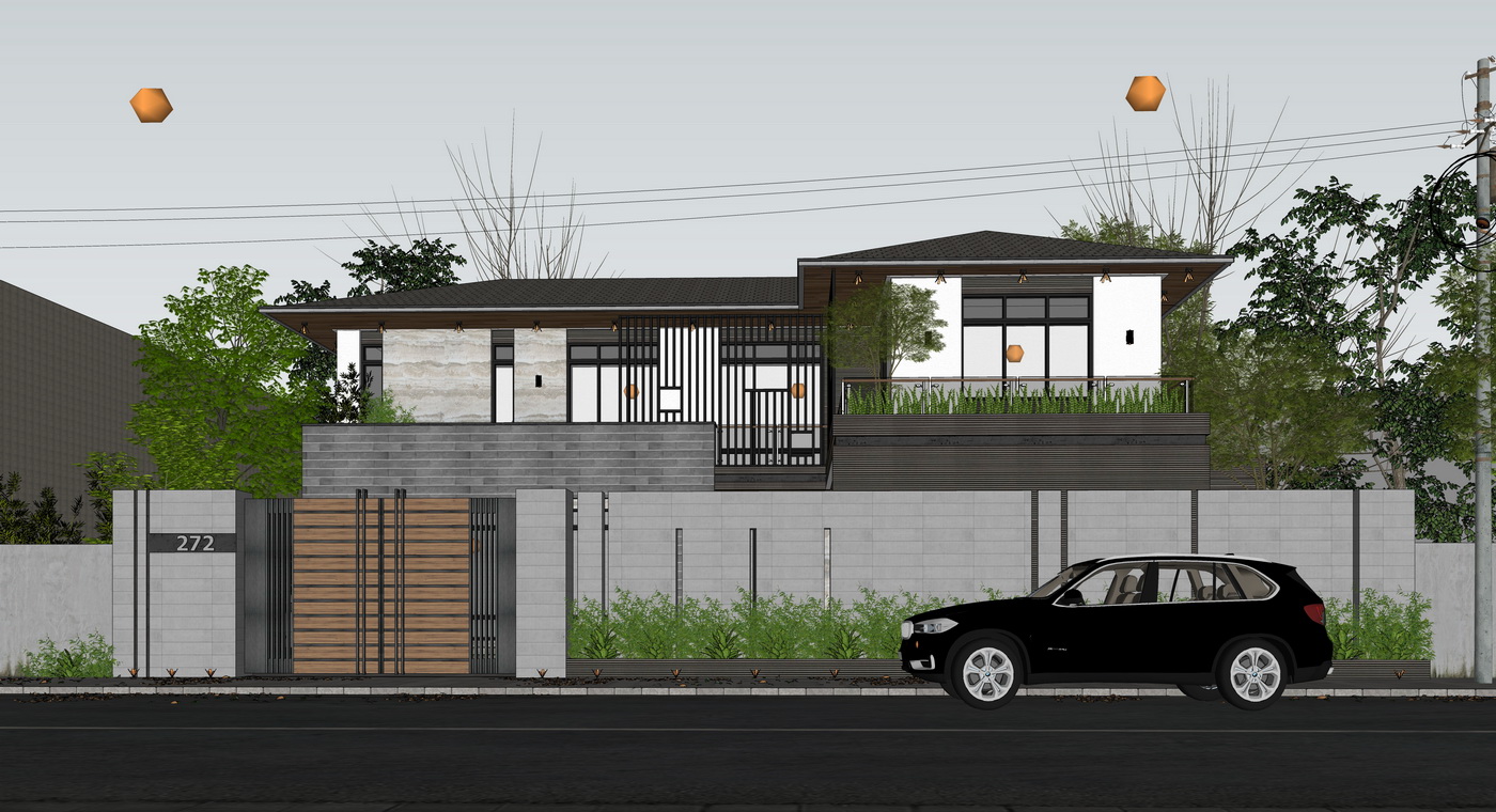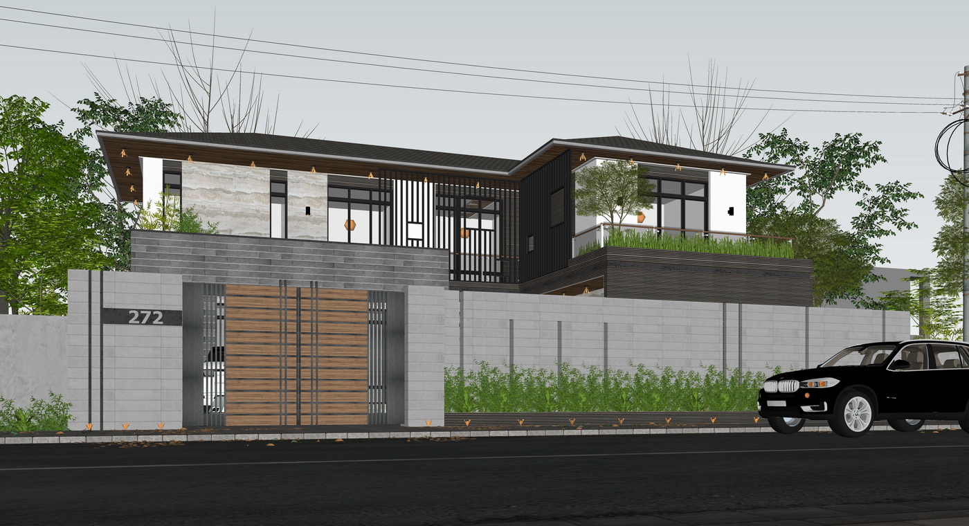 Hình ảnh này giới thiệu về một bản mô hình 3D của một ngôi nhà hiện đại. Ngôi nhà được thiết kế với hai tầng, có kiến trúc tối giản và đường nét tinh tế. Đây là một căn nhà được bao quanh bởi hàng rào kiên cố, cửa ra vào chính bằng gỗ và các cửa sổ lớn mang lại ánh sáng tự nhiên dồi dào cho không gian bên trong.