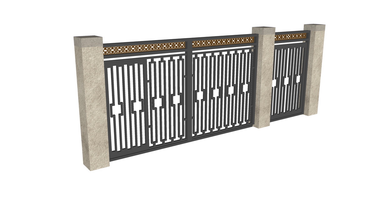Mô hình cổng này thể hiện một thiết kế hiện đại và tinh tế với các chi tiết sắc nét. Hình ảnh minh họa cho thấy cổng bao gồm một khung bê tông chắc chắn kết hợp với các thanh sắt thẳng đứng được sắp xếp thành kiểu dáng hiện đại. Trên cùng của cổng là dải hoa văn bắt mắt, giúp tăng thêm nét thẩm mỹ cho cấu trúc tổng thể.