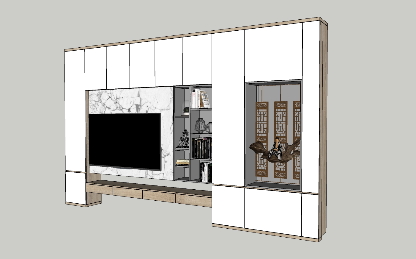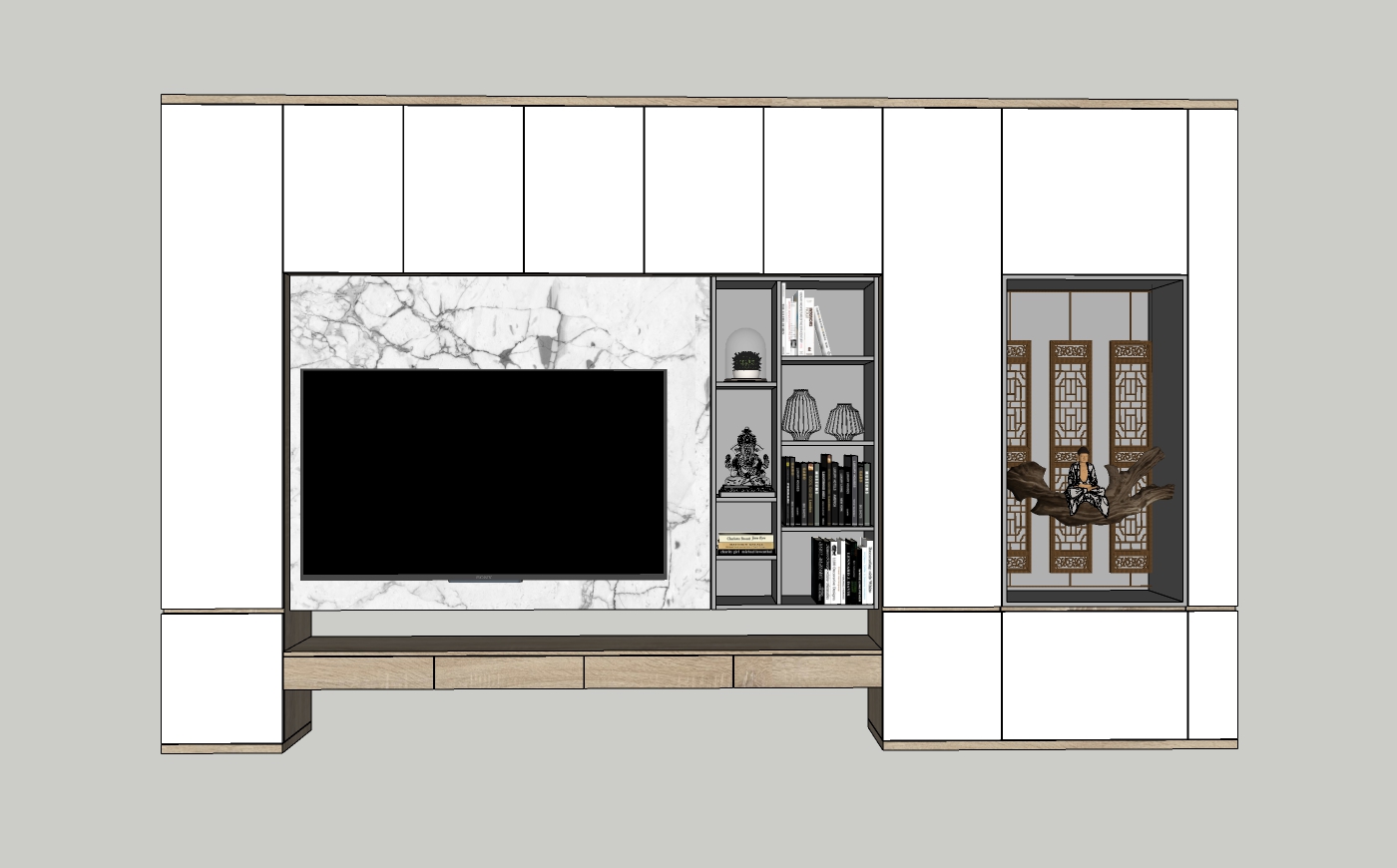 Hệ thống tủ kệ này mang đến một cấu trúc hài hòa với sự kết hợp hoàn hảo giữa chất liệu gỗ tự nhiên và bề mặt giả đá.
