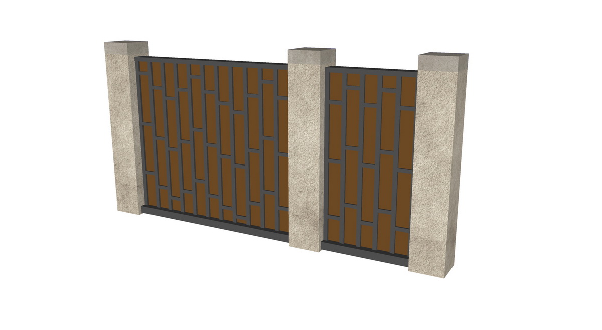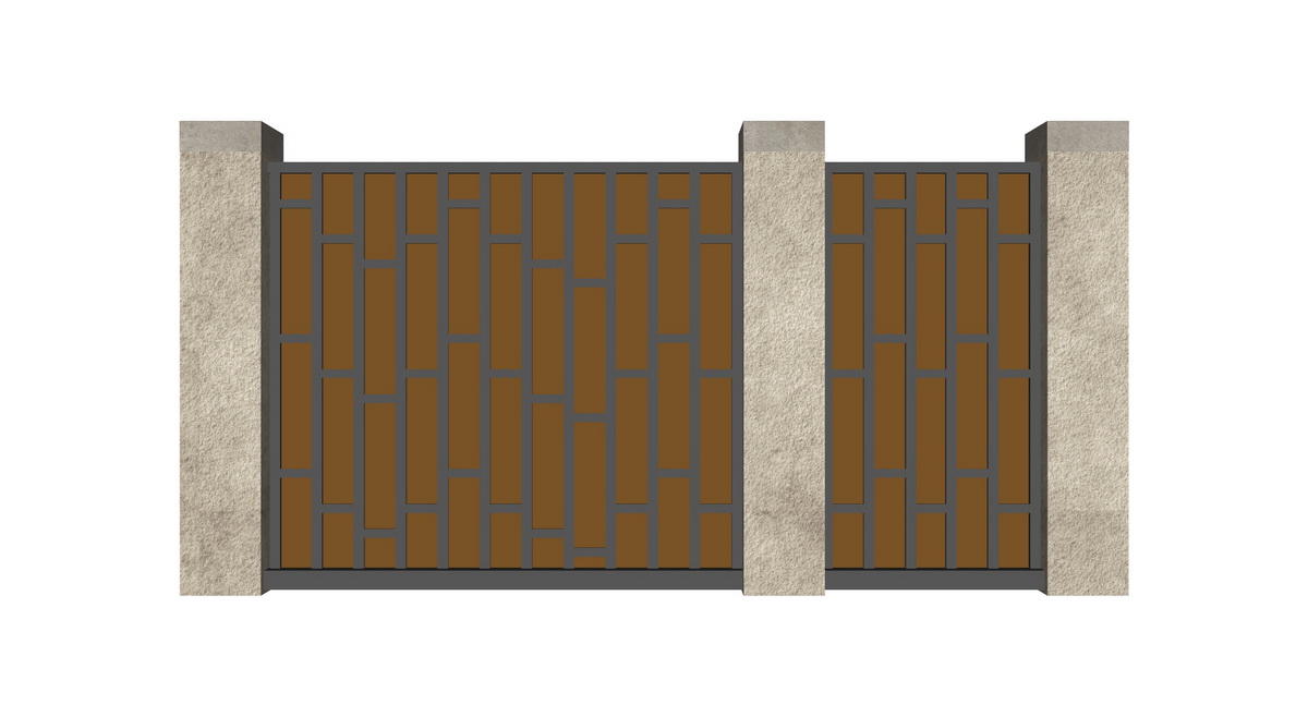 Mô hình này thể hiện một bức tường rào vững chắc với phong cách thiết kế hiện đại. Được cấu tạo từ các khối xi măng làm cột và các mảng ghép gỗ theo chiều dọc, bức tường này mang lại vẻ đẹp thẩm mỹ và cảm giác an toàn. Màu nâu của gỗ kết hợp hoàn hảo với màu xám của bê tông, tạo ra sự tương phản bắt mắt nhưng vẫn hài hòa.