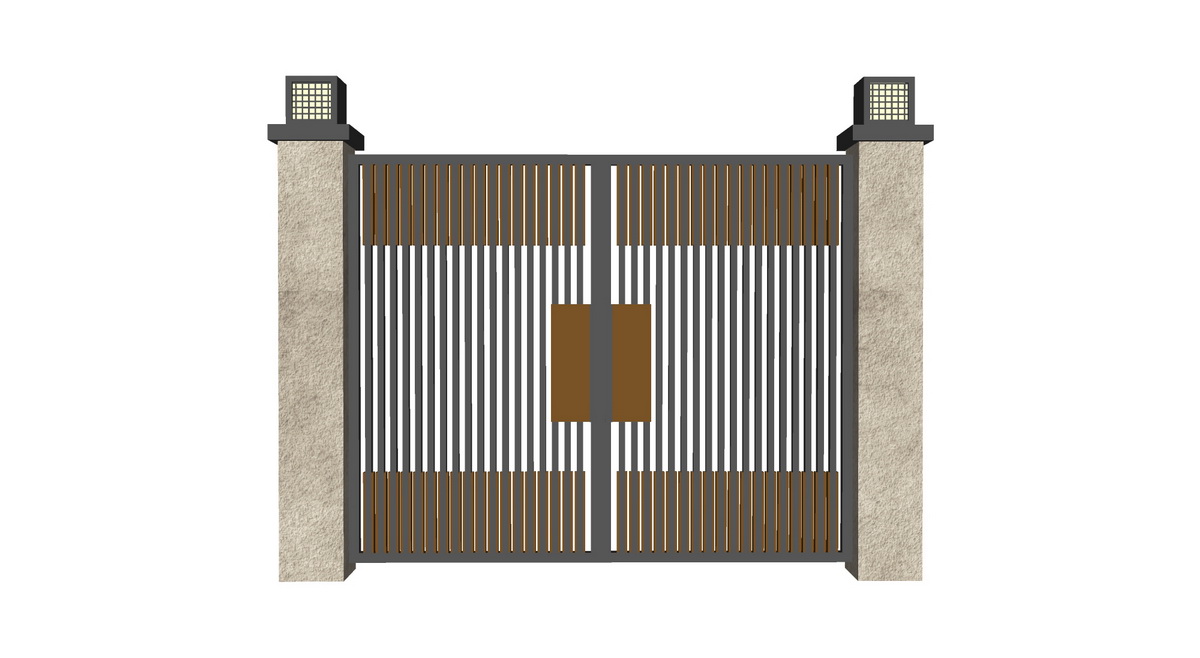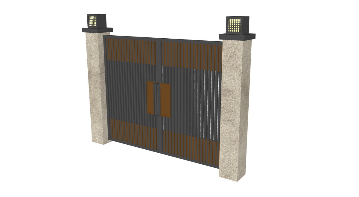 Mô hình cổng được minh họa rõ ràng trong hình ảnh với thiết kế hiện đại, tập trung vào sự đơn giản và tính ứng dụng thực tế. Cổng được thiết kế với vật liệu kim loại, màu sắc chủ đạo là xám và nâu, tạo nên vẻ đẹp tinh tế, dễ dàng hài hòa với nhiều phong cách kiến trúc khác nhau. Các cột trụ vững chắc được làm từ đá hoặc vật liệu có bề mặt xám thô sơ, gợi lên sự bền vững và mạnh mẽ.