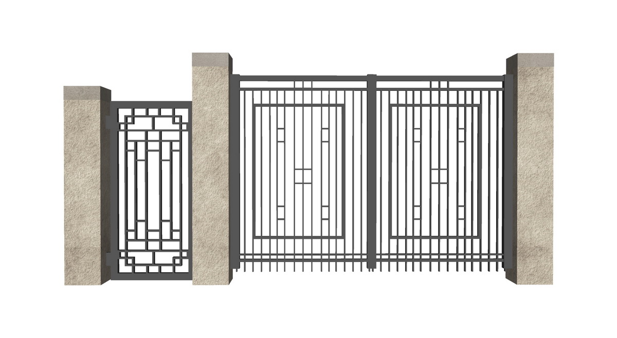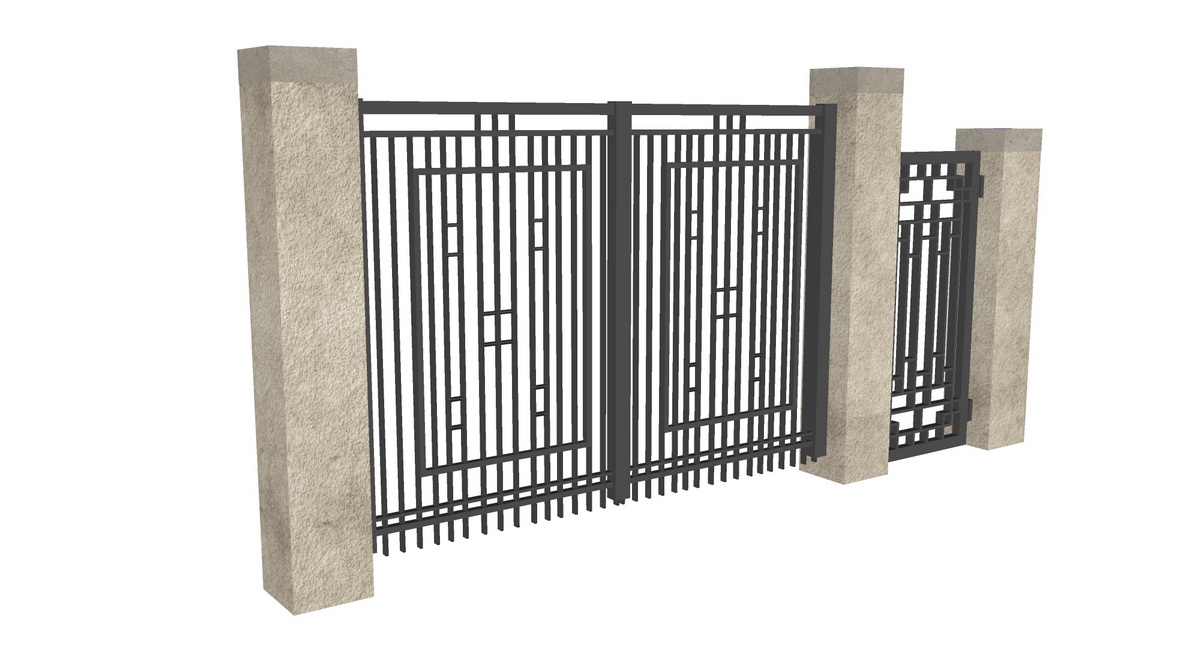 Mô hình SketchUp này mang đến một thiết kế cổng sắt mạnh mẽ, kết hợp hài hòa giữa chi tiết và tính thực dụng. Những hình ảnh hiển thị cho thấy cấu trúc cổng gồm ba phần chính: một cánh cửa lớn hai cánh và một cửa nhỏ hơn, được gắn vào trụ đá chắc chắn. Khung cổng được tạo nên từ các thanh sắt song song và vuông góc, kết hợp với các hoa văn hình học tạo nên sự hài hòa và phong cách.