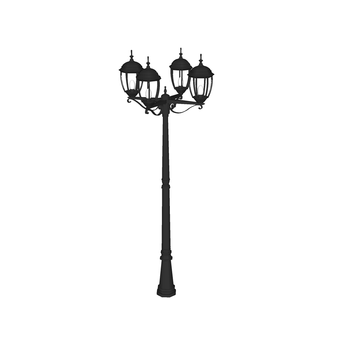 Các hình ảnh trên mô tả một mẫu đèn đường phong cách cổ điển, được chế tác với chi tiết sắc sảo. Mỗi cột đèn bao gồm bốn bóng đèn, được bao phủ bởi khung sắt mỹ thuật, tạo nên vẻ ngoài sang trọng và cổ kính.