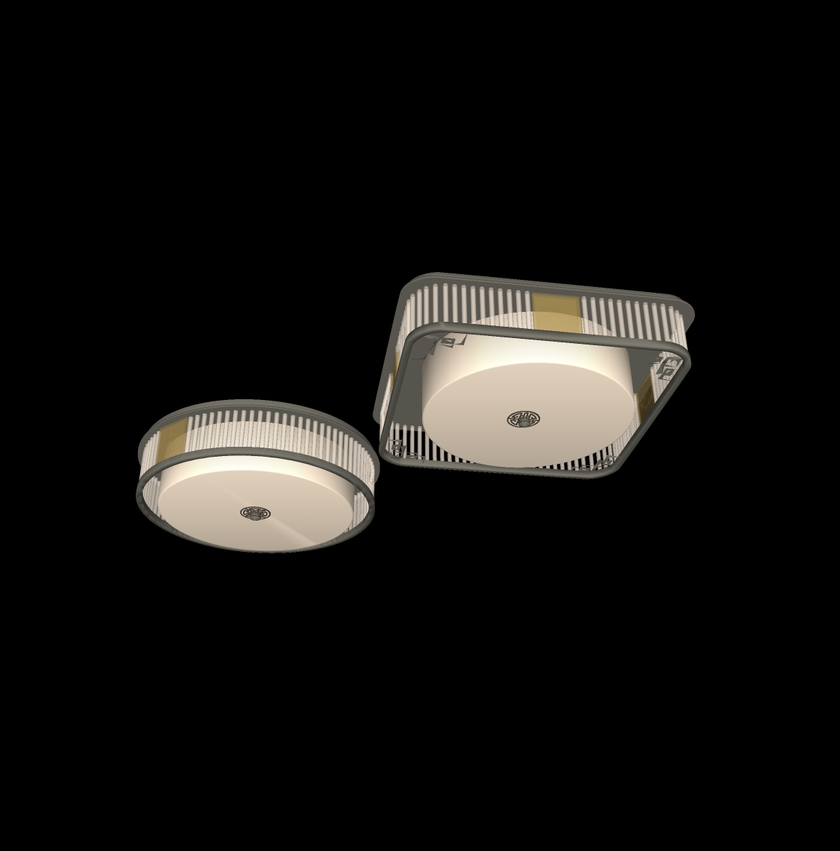 Hình ảnh đầu tiên cho thấy hai thiết kế đèn trần độc đáo, một hình vuông và một hình tròn, được gắn trên trần nhà. Cả hai mẫu đều có cấu trúc tinh tế với khung kim loại phối hợp cùng các sọc đen trắng tạo nên sự hài hòa hiện đại. Đèn tròn mang nét mềm mại trong khi đèn vuông tạo cảm giác cứng cáp, chắc chắn.