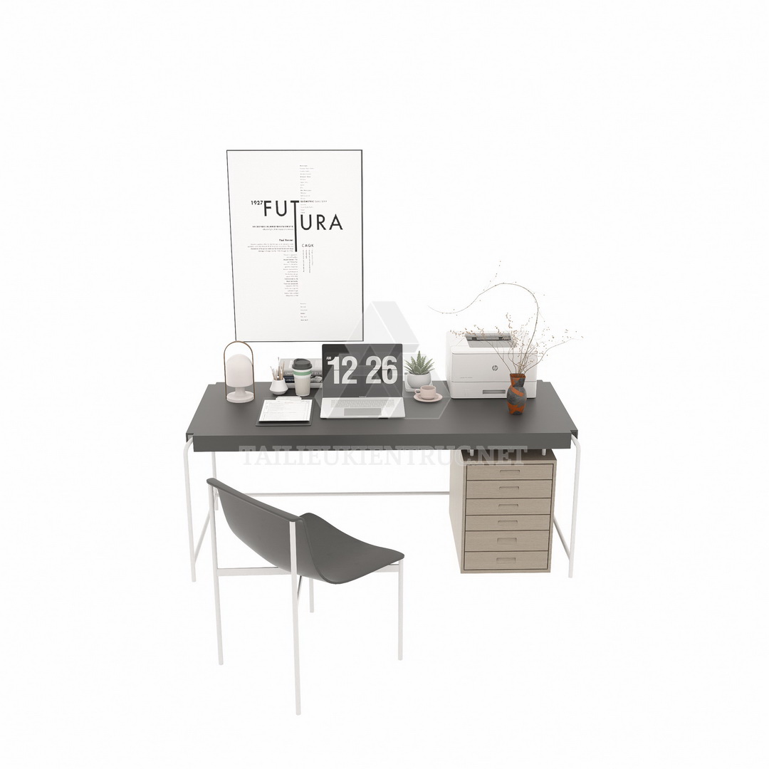 Trong các hình ảnh, một không gian văn phòng được bày trí gọn gàng và hợp lý, bao gồm một bàn làm việc hiện đại với tông màu trắng đen chủ đạo. Trên mặt bàn, có các vật dụng như máy tính xách tay, đèn bàn, và một số phụ kiện trang trí như cây cảnh nhỏ và bình hoa, tạo cảm giác tiện nghi và thoải mái.