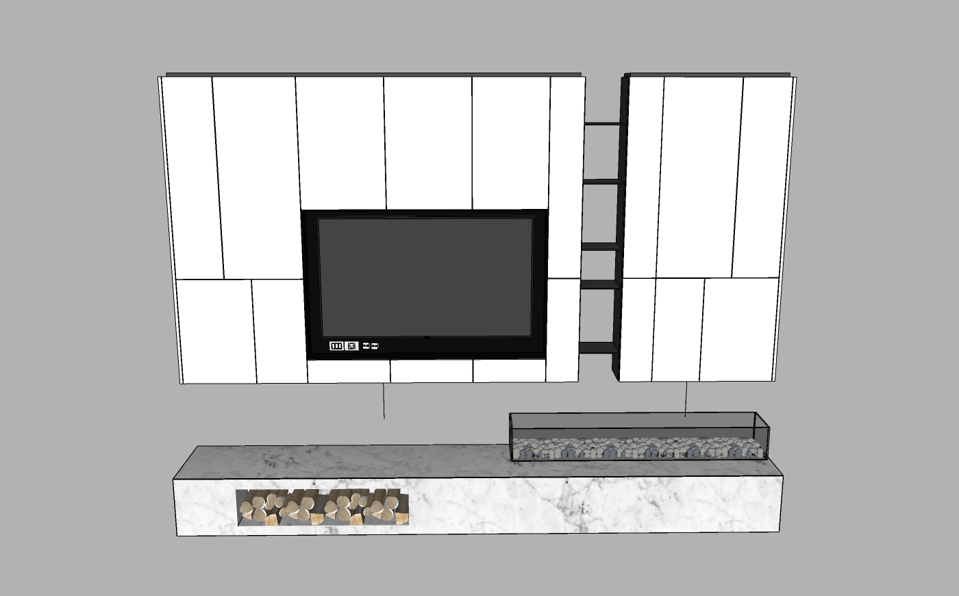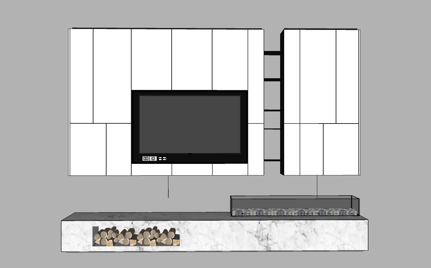 Hình ảnh đầu tiên cho thấy một thiết kế tủ kệ với sự tối giản và tinh tế. Kết cấu chủ yếu bằng gỗ và đá cẩm thạch, sản phẩm không chỉ mang lại cảm giác hiện đại mà còn rất thanh lịch. Phần tủ được bố trí đối xứng quanh một trung tâm là màn hình TV lớn, tạo ra sự cân xứng và thẩm mỹ cho toàn bộ không gian.
