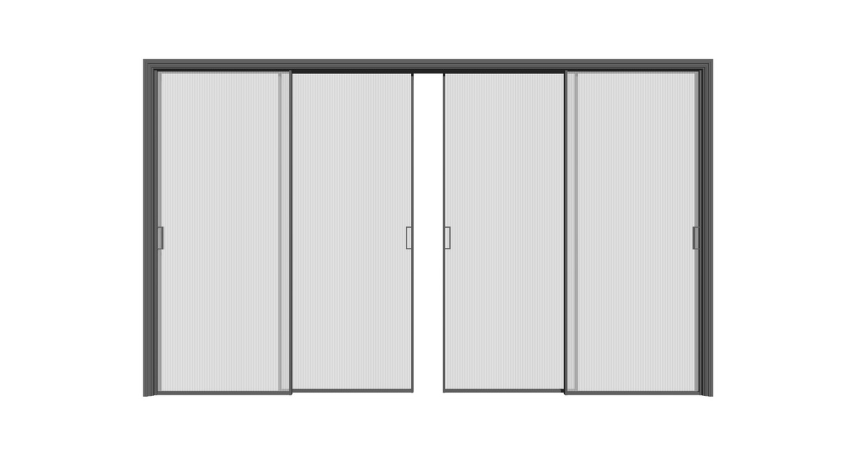 Hình ảnh hiển thị một hệ thống cửa trượt kính với thiết kế tối giản và hiện đại. Sản phẩm này là sự kết hợp hoàn hảo giữa khung kim loại bền bỉ và kính có hoa văn sọc dọc tinh tế.