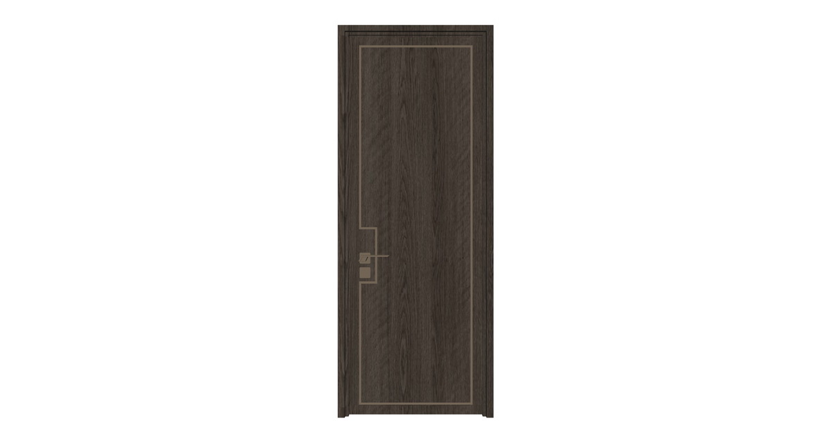 Mẫu cửa trong hình ảnh thể hiện thiết kế tinh tế với chất liệu gỗ tự nhiên tối màu, kết hợp cùng đường viền kim loại thanh lịch bao quanh, tạo nên vẻ ngoài hiện đại, tinh tế. Tay nắm cửa được thiết kế đơn giản mà thời trang, hài hòa với tổng thể.