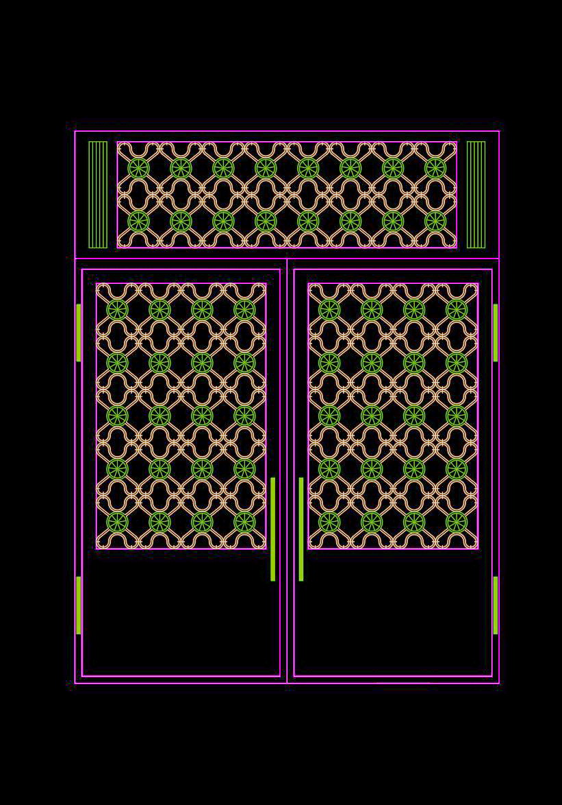 Hình ảnh thứ hai là bản vẽ kỹ thuật màu sắc, nhấn mạnh các chi tiết với màu sắc tương phản nhằm giúp người thiết kế dễ dàng nhận diện các thành phần khác nhau của cửa sổ. Màu xanh lá cây và hồng được sử dụng để làm nổi bật các chi tiết hoa văn, trong khi nền đen làm tôn lên các đường trang trí tinh tế.
