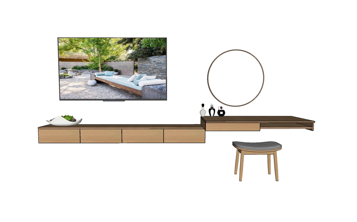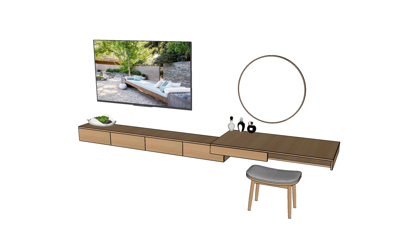 Trong hình ảnh, chúng ta có thể thấy một mẫu thiết kế nội thất đơn giản nhưng vô cùng thanh lịch với sự phối hợp giữa kệ tivi, bàn trang điểm, và ghế đẩu. Sản phẩm này nhấn mạnh vào sự tối giản và tính thực dụng, phù hợp với xu hướng thiết kế hiện đại.