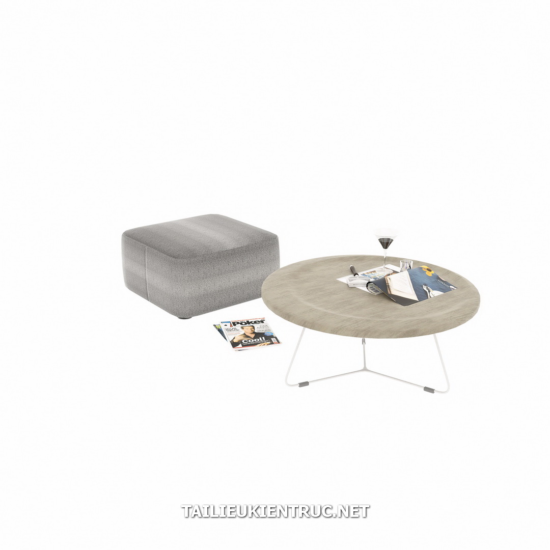 Trong các hình ảnh này, chúng ta có thể nhận thấy một sự kết hợp hài hòa giữa bàn tròn và ghế đôn vuông. Bàn tròn có mặt bằng gỗ với chân kim loại mảnh, tạo cảm giác nhẹ nhàng và thanh thoát. Ghế đôn vuông với bề mặt vải bọc, màu sắc trung tính mang đến cảm giác thoải mái và dễ chịu. Trên mặt bàn, có sự hiện diện của các vật trang trí như ly uống nước, tạp chí và sách, giúp mô phỏng khung cảnh sinh hoạt thực tế.