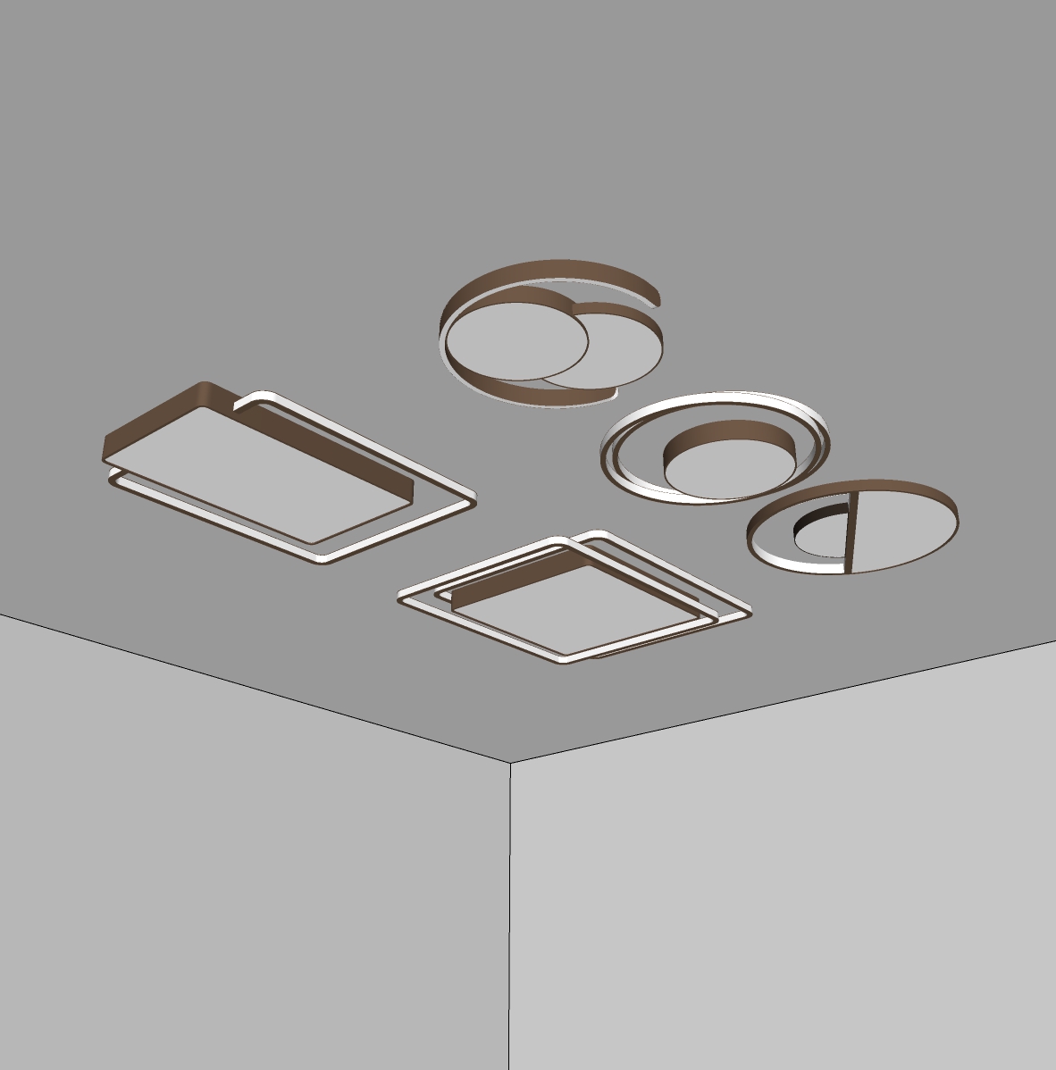 Trong hình ảnh đầu tiên, chúng ta thấy một tập hợp các mẫu đèn trần với thiết kế hình học ấn tượng. Các đèn được thiết kế dưới dạng hình tròn, hình vuông, và các cấu trúc kết hợp sáng tạo. Những viền đèn tỏa sáng nhẹ nhàng, tạo nên một không gian ấm cúng và sang trọng.