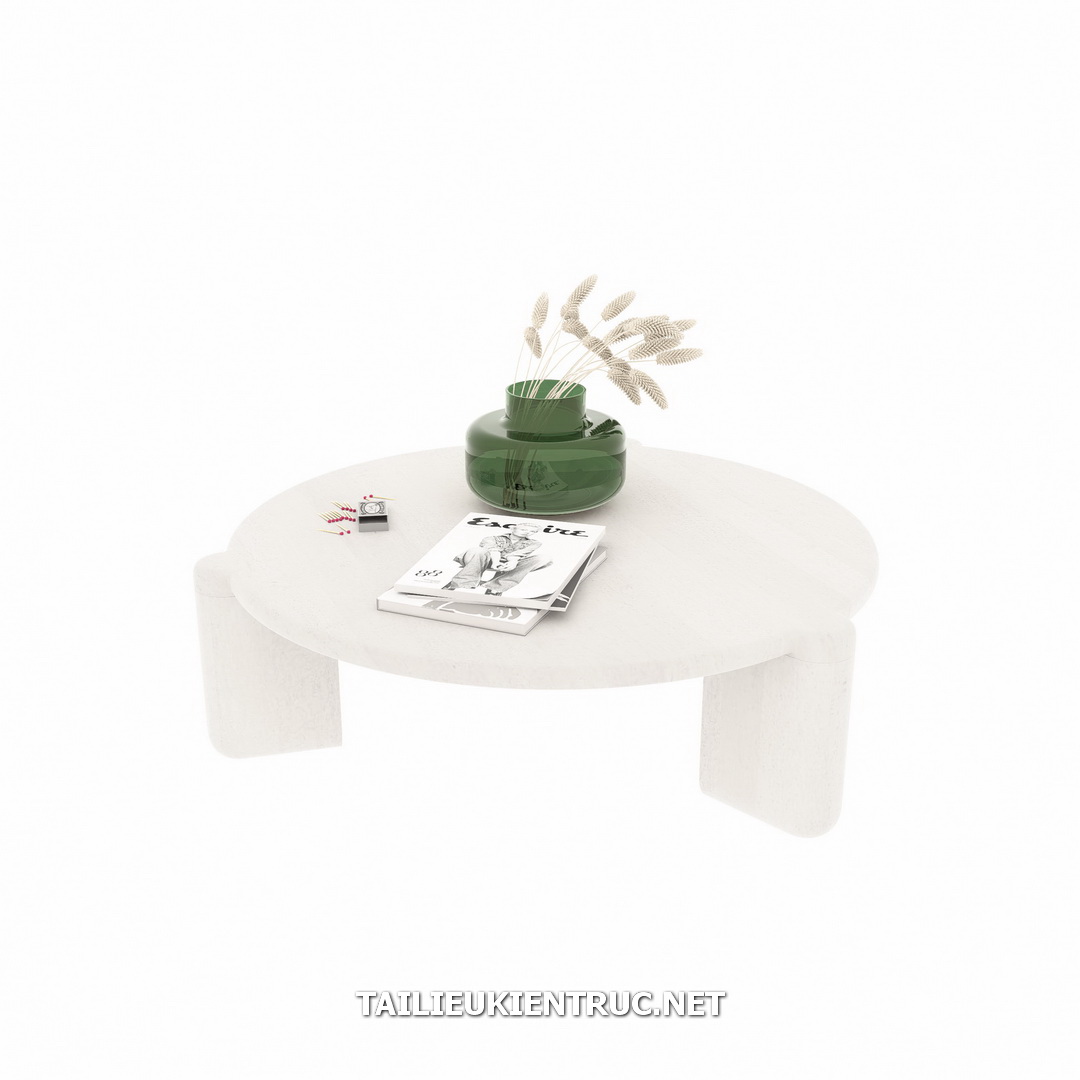 Chiếc bàn trà này có thiết kế hình tròn, tạo cảm giác mềm mại và thân thiện. Với màu sáng chủ đạo, sản phẩm này phù hợp với nhiều phong cách trang trí khác nhau. Trên mặt bàn, có một lọ hoa thủy tinh màu xanh lục đậm với một số bông hoa khô tạo điểm nhấn nổi bật, đồng thời thể hiện sự tinh tế và sinh động của thiết kế.