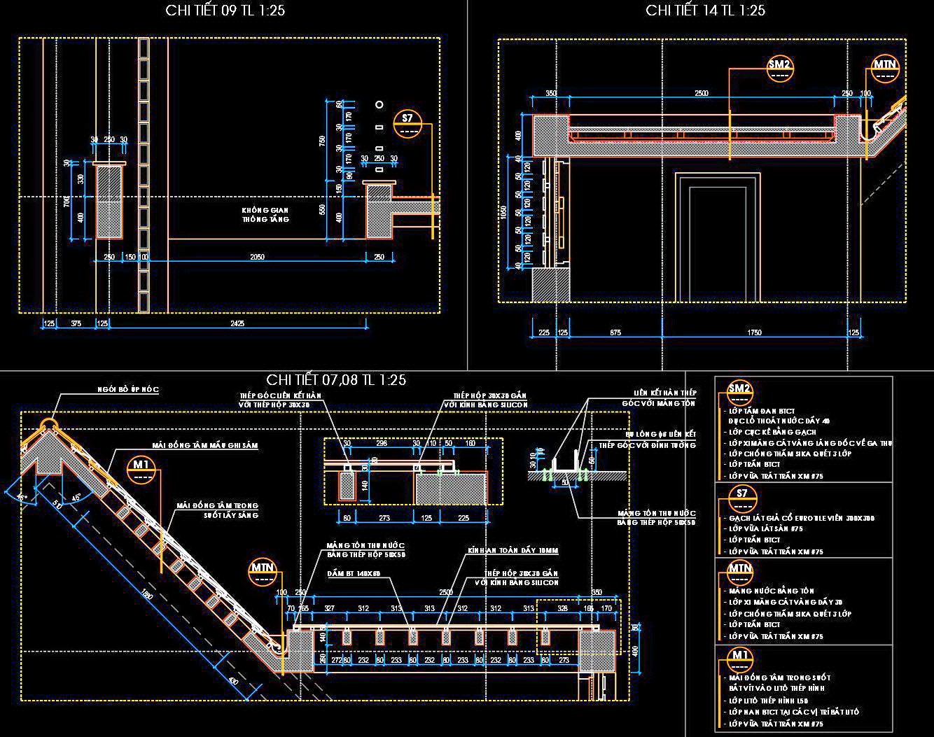 Các hình ảnh này mô tả chi tiết các bản vẽ kỹ thuật của mái ngói với nhiều chi tiết chính xác và rõ ràng. Bản vẽ trình bày cấu trúc mái, cách lớp lợp và các điểm nút quan trọng như cách bố trí liên kết giữa các vật liệu và bộ phận. Những đường kẻ và thông số kỹ thuật chi tiết được hiển thị rõ ràng, hỗ trợ tốt cho việc triển khai xây dựng thực tế.