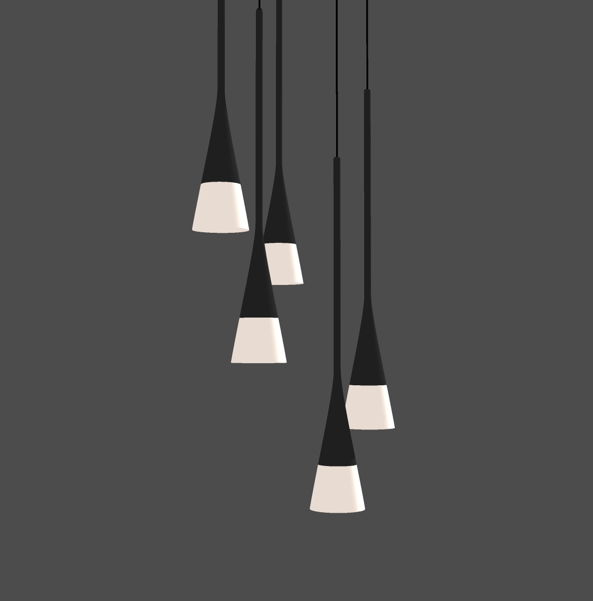Chùm ảnh mô tả một thiết kế đèn treo với kiểu dáng tinh tế, hiện đại. Bộ đèn gồm năm chiếc đèn treo có thiết kế hình nón ngược, tạo ra vẻ đẹp tối giản nhưng độc đáo. Màu sắc chủ đạo là đen bóng, kết hợp với chất liệu kim loại tạo cảm giác sang trọng và cao cấp. Ánh sáng phát ra từ đèn có độ sáng nhẹ, mang lại không gian ấm áp, dễ chịu.