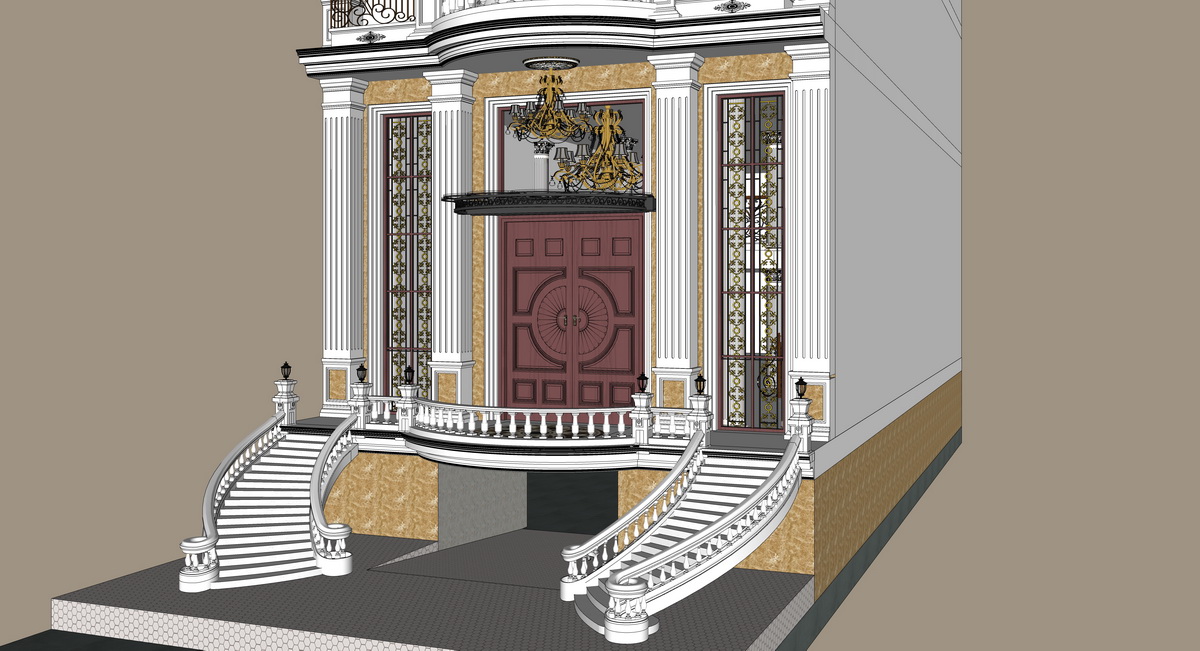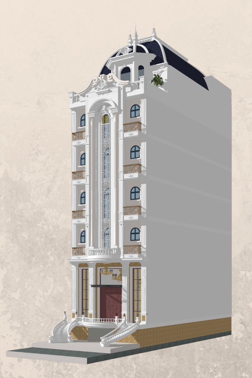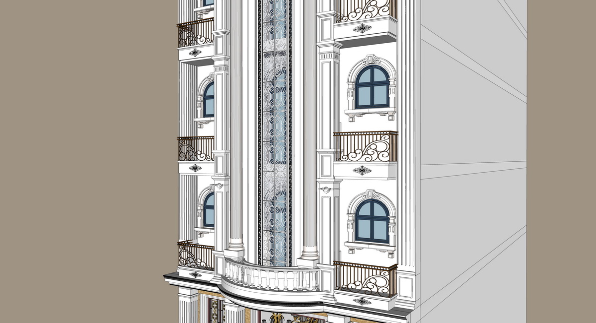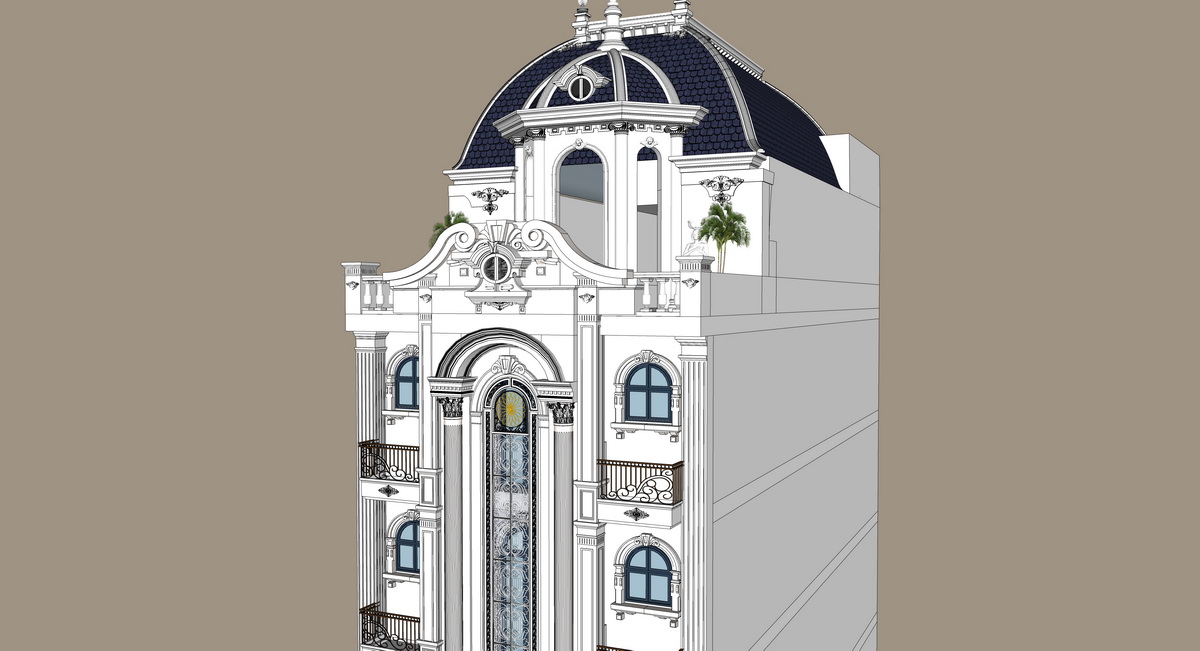 Mô hình SketchUp này biểu hiện sự tinh tế và chi tiết của kiến trúc hiện đại châu Âu. Tòa nhà có nhiều tầng với mặt tiền được thiết kế công phu, kết hợp giữa đường nét cổ điển và hiện đại. Các chi tiết phào chỉ trang trí cùng ban công uốn lượn tạo điểm nhấn cho tòa nhà. Mái vòm lớn màu xanh đậm ở trên cùng không chỉ thể hiện sự bề thế mà còn tối ưu hóa không gian.