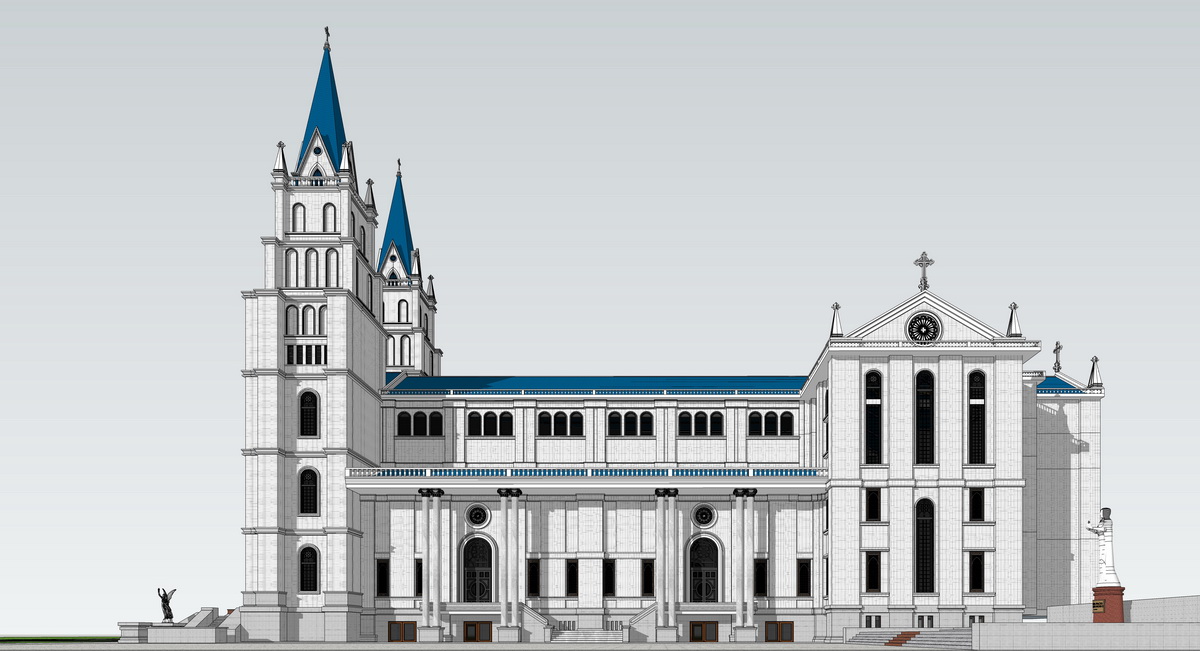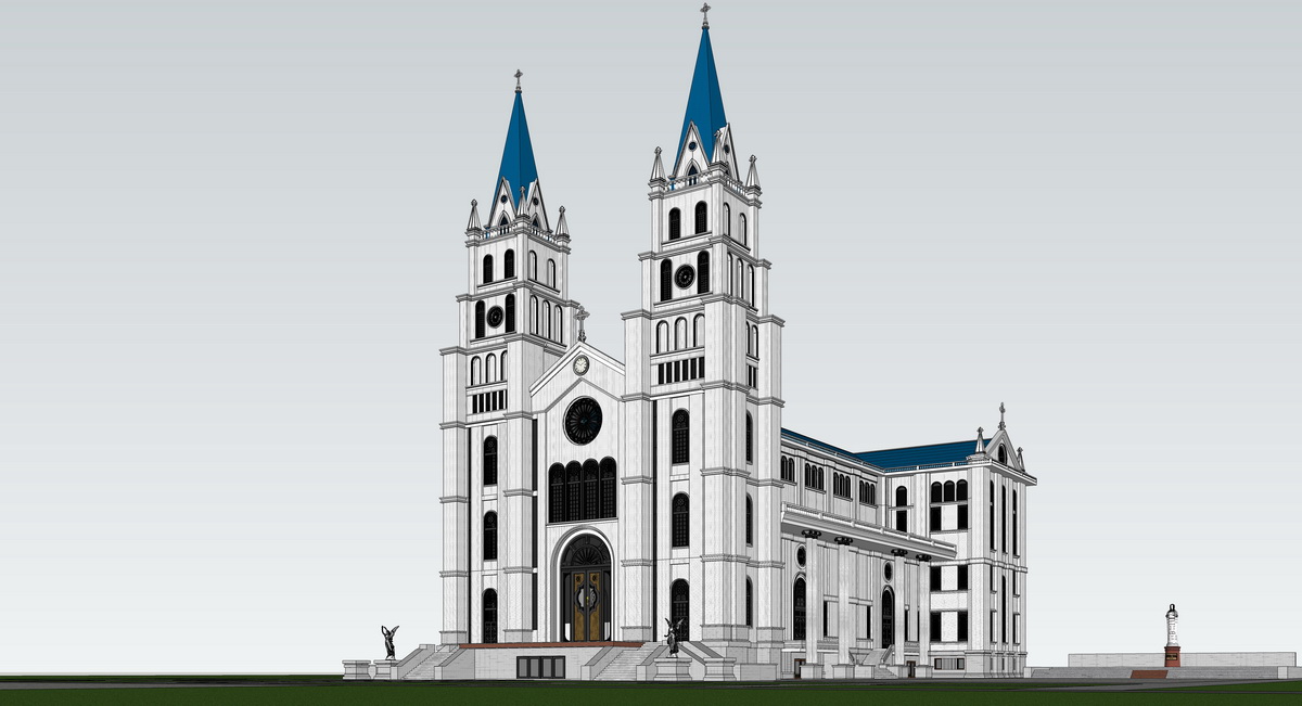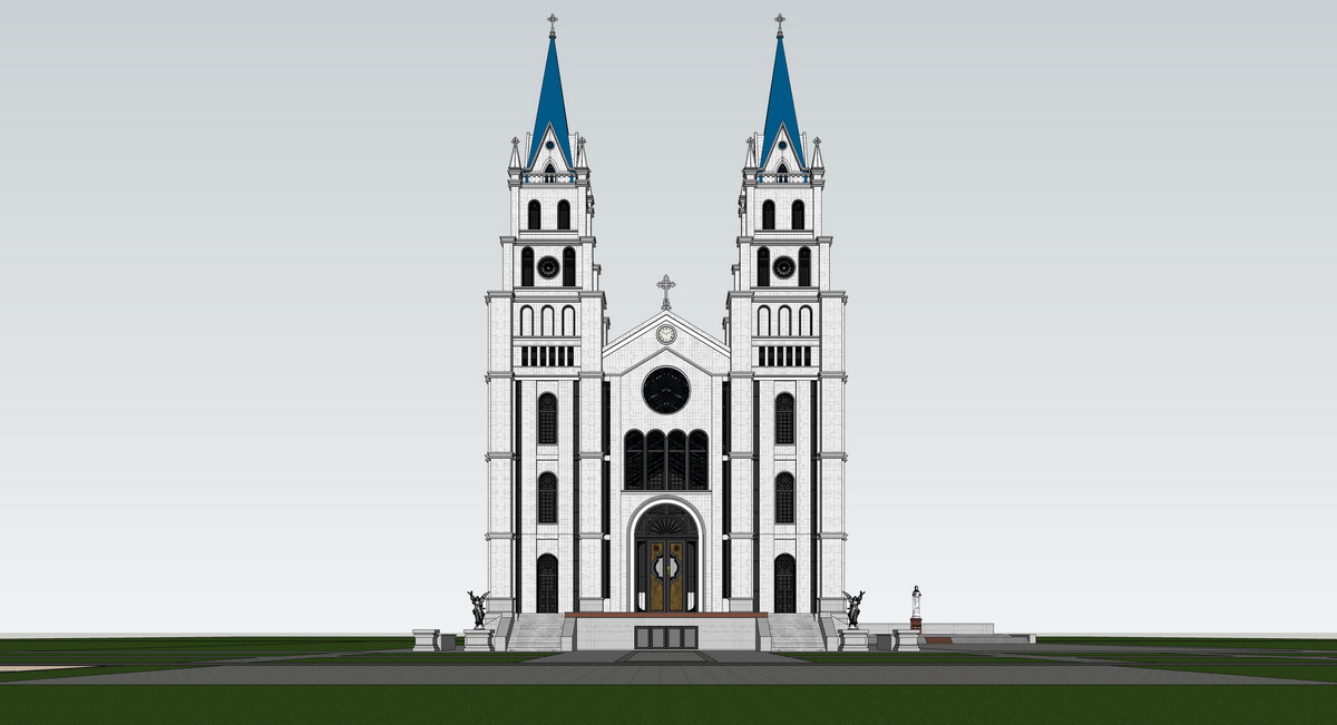 Mô hình 3D của nhà thờ này thể hiện kiến trúc Gothic cổ điển với hai tháp chuông cao vút, mái nhọn và những cửa sổ mái vòm đặc trưng. Cửa chính với thiết kế tỉ mỉ cùng các chi tiết điêu khắc tinh tế tạo nên sự uy nghi và trang trọng cho công trình. Màu sắc chủ đạo là trắng với mái ngói xanh đậm, tạo sự nổi bật và dễ nhận diện.