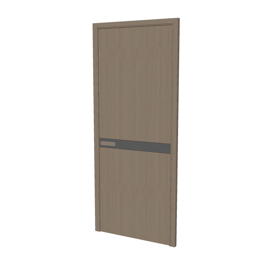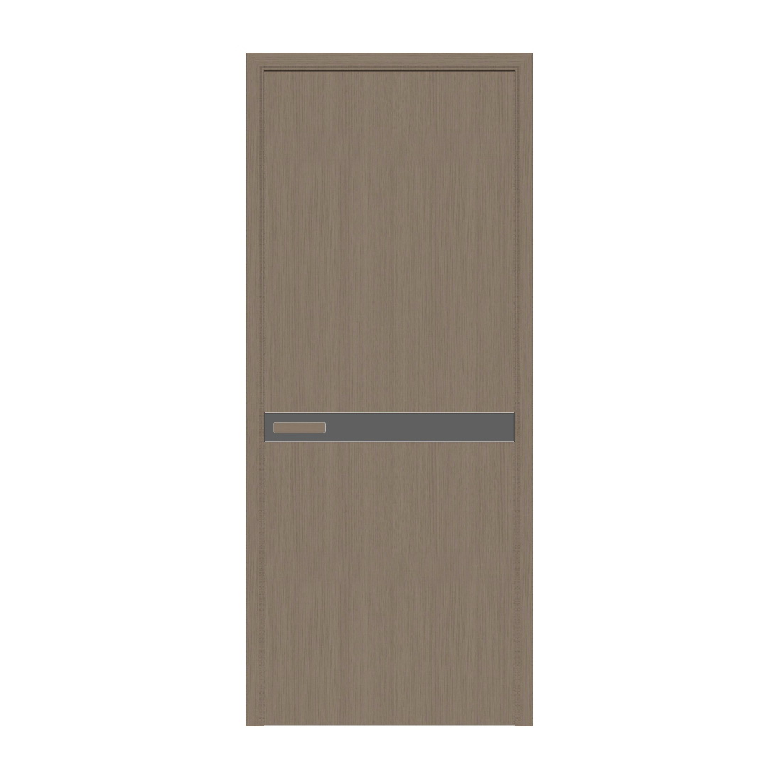 Mẫu cửa gỗ đầu tiên thể hiện sự ấm áp và tự nhiên thông qua sắc nâu trầm với các vân gỗ hiển thị rõ ràng, mang lại cảm giác thân thiện cho không gian. Thiết kế bổ sung một dải ngang bằng kim loại màu tối ở giữa cửa, tạo điểm nhấn hiện đại và cứng cáp. Tay nắm cửa được thiết kế tinh tế với kết hợp kim loại cao cấp.