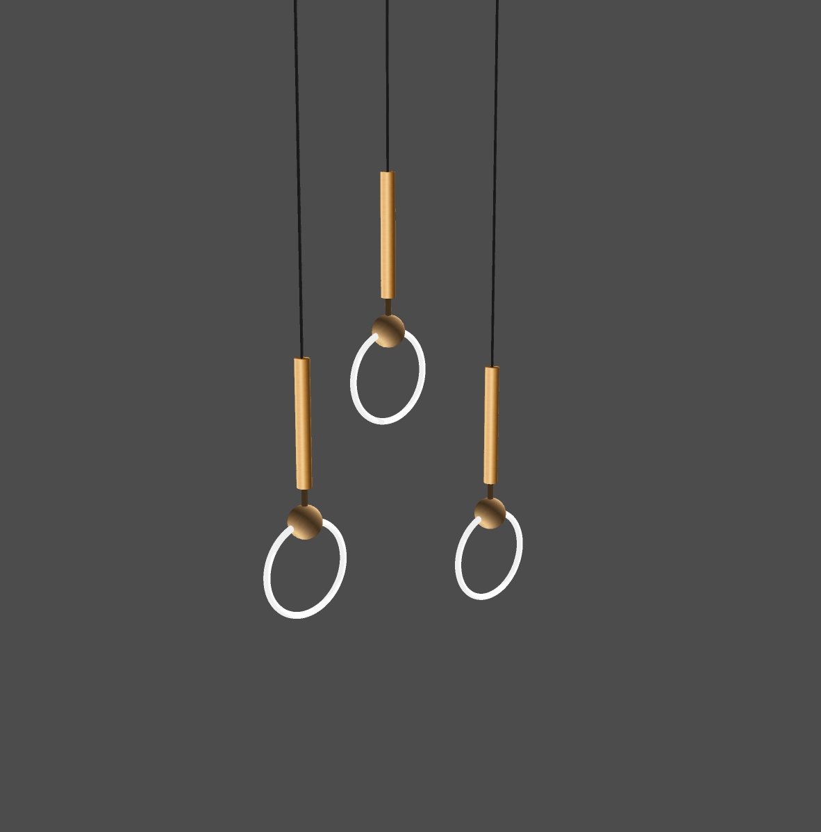 Mẫu đèn treo này có thiết kế độc đáo với ba bộ phận chính: thanh kim loại màu vàng đồng sáng bóng, dây treo màu đen, và vòng tròn phát sáng màu trắng. Các chi tiết này tạo ra một tổng thể đơn giản mà không kém phần tinh tế, giúp nổi bật trong nhiều không gian khác nhau.