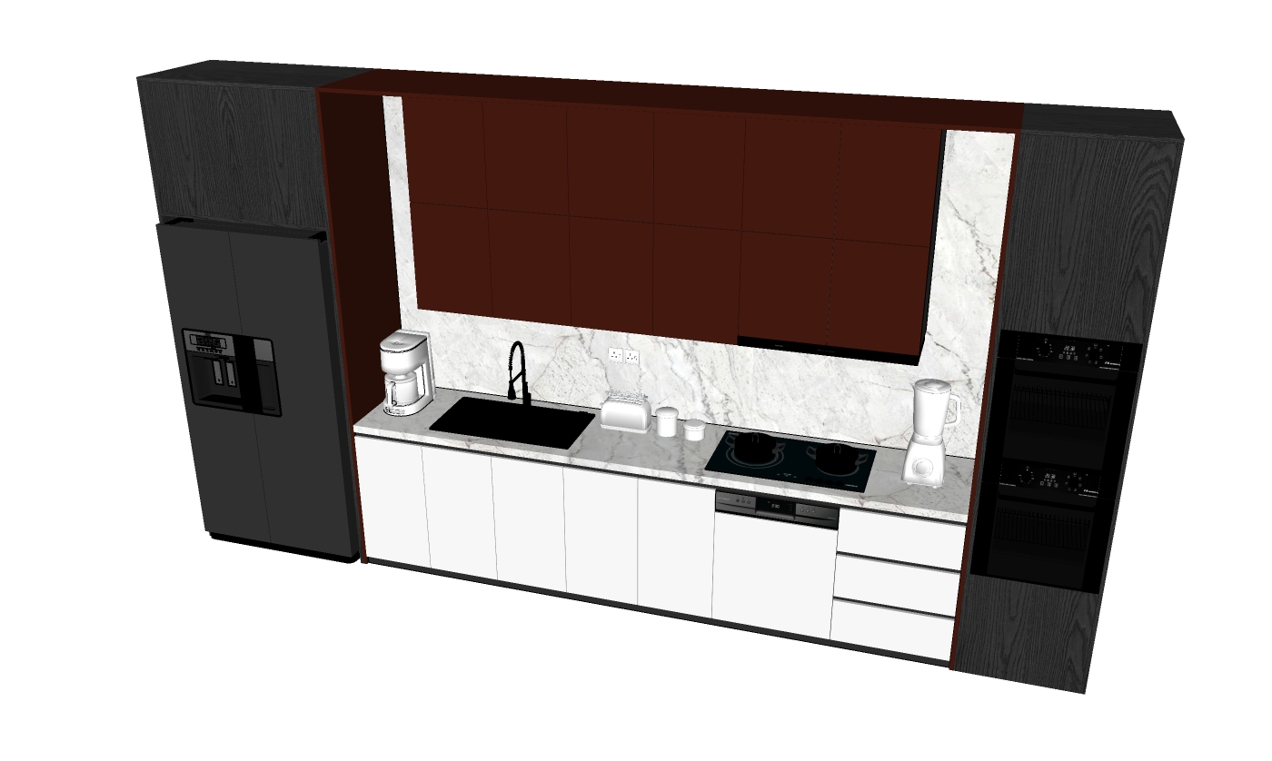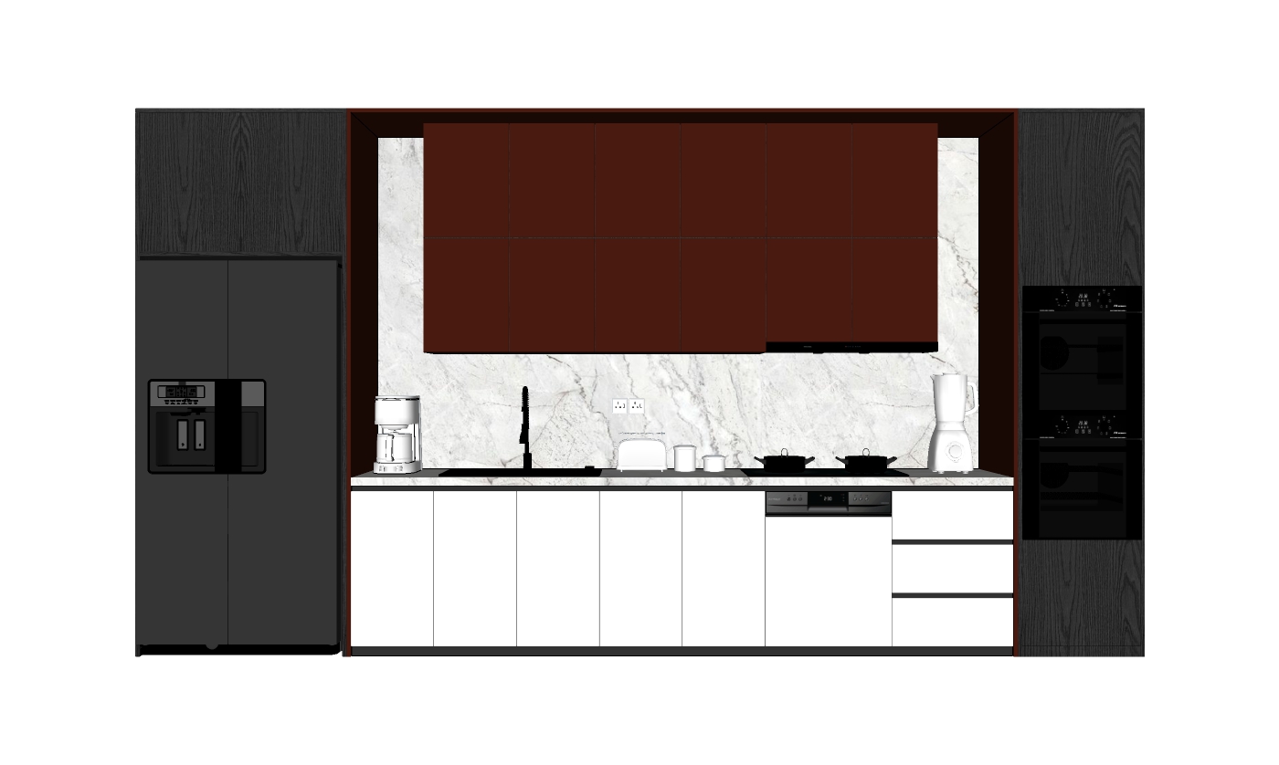 Mô hình trong hình ảnh miêu tả một không gian bếp hiện đại với tính thẩm mỹ cao, sử dụng các vật liệu và màu sắc hài hòa. Được thiết kế với tông màu chủ đạo là nâu, đen và trắng, mẫu bếp này mang lại cảm giác sang trọng và sự tiện nghi tối ưu. Khu vực mặt bàn bếp được lát đá cẩm thạch, hòa quyện cùng các thiết bị nhà bếp hiện đại như tủ lạnh đôi, máy pha cà phê, máy trộn và bếp từ.