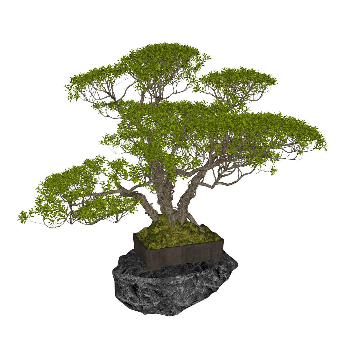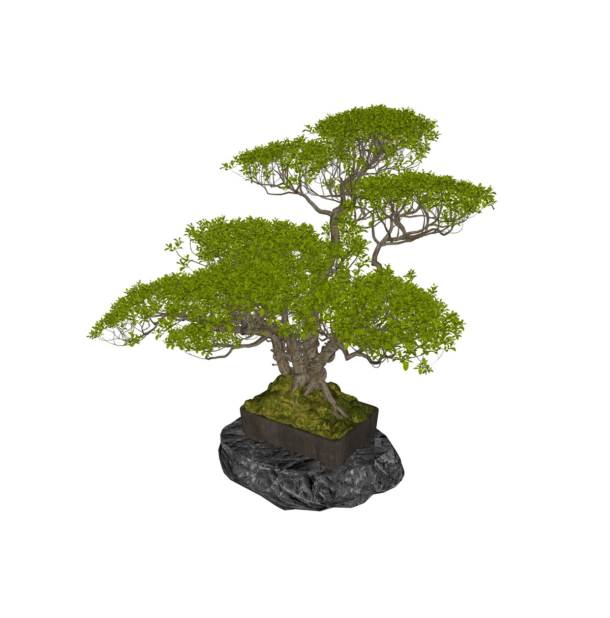 Các chi tiết như kích thước và vật liệu của mẫu bonsai được chú trọng, chính xác đến từng đường nét. Chất liệu đá đế tạo nên vẻ vững chắc và tự nhiên, đồng thời màu xanh của tán lá kết hợp một cách hài hòa.