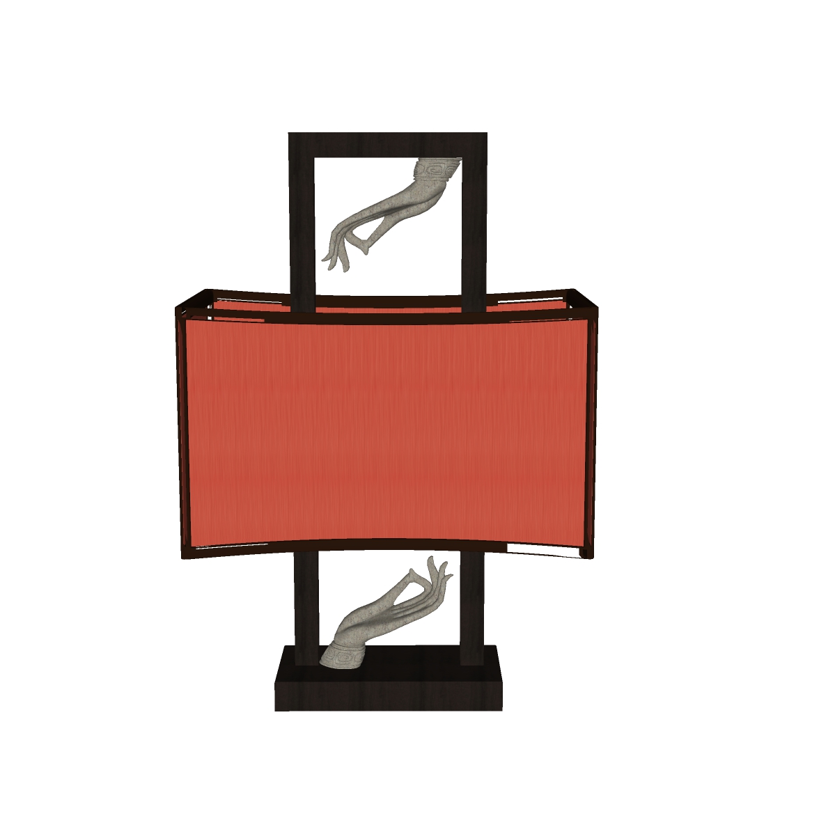 Mẫu đèn này nổi bật với thiết kế tối giản nhưng không kém phần ấn tượng. Được chế tác từ các vật liệu cao cấp, đèn bao gồm một khung đen chắc chắn và lớp vải bao quanh có màu đỏ tạo nên sự tương phản nổi bật. Chi tiết đáng chú ý là những hình ảnh điêu khắc bàn tay, mang đến phong cách nghệ thuật độc đáo và tinh tế.