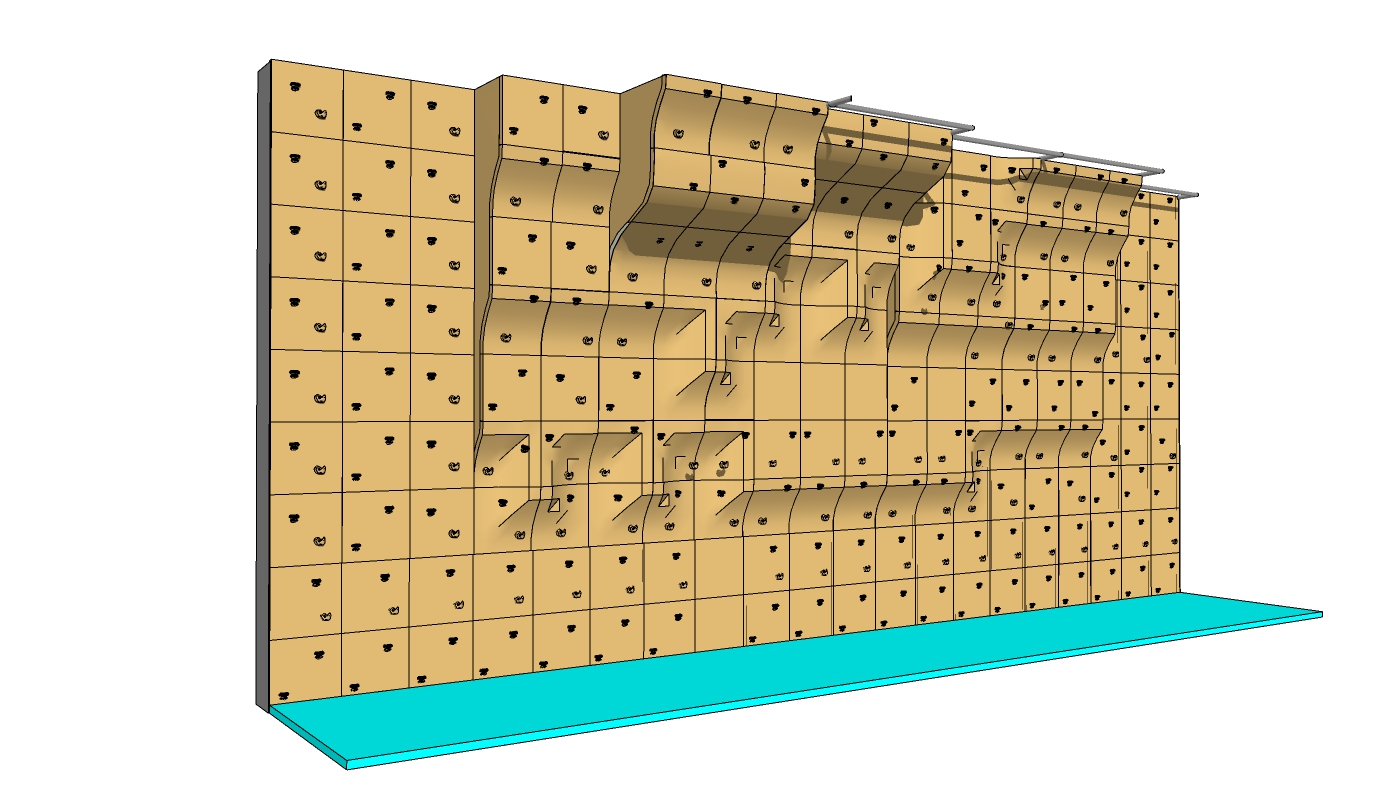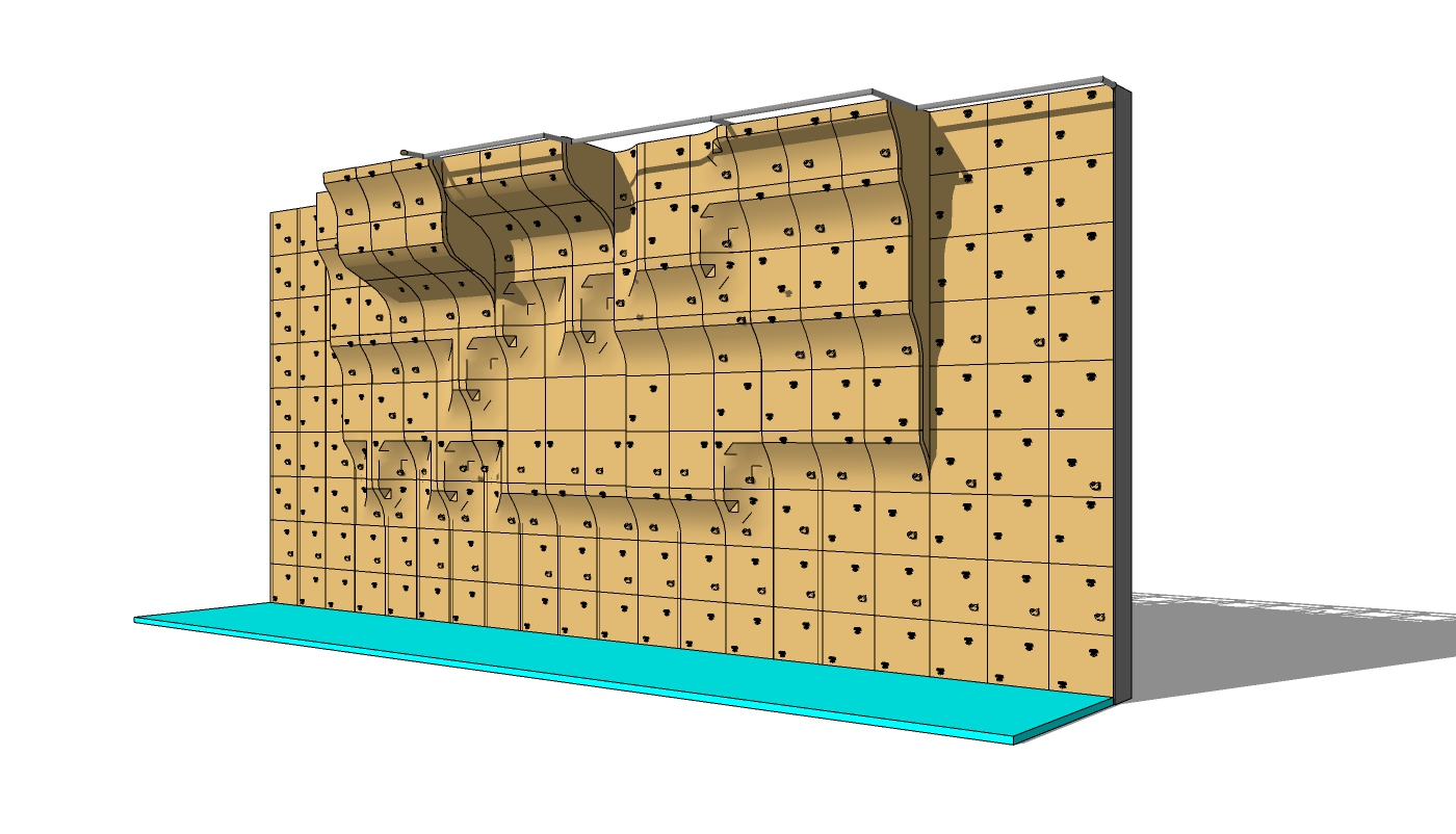 Trong hình ảnh, chúng ta nhìn thấy một mô hình 3D của tường leo núi với các chi tiết rõ ràng, thể hiện tính linh hoạt và khả năng thực tiễn của thiết kế. Mô hình bao gồm một bề mặt tường phẳng với các khối ô vuông, lát gạch mô phỏng, cùng với các điểm bám tay được sắp xếp ngẫu nhiên để tạo ra độ khó và sự thách thức cho người sử dụng.