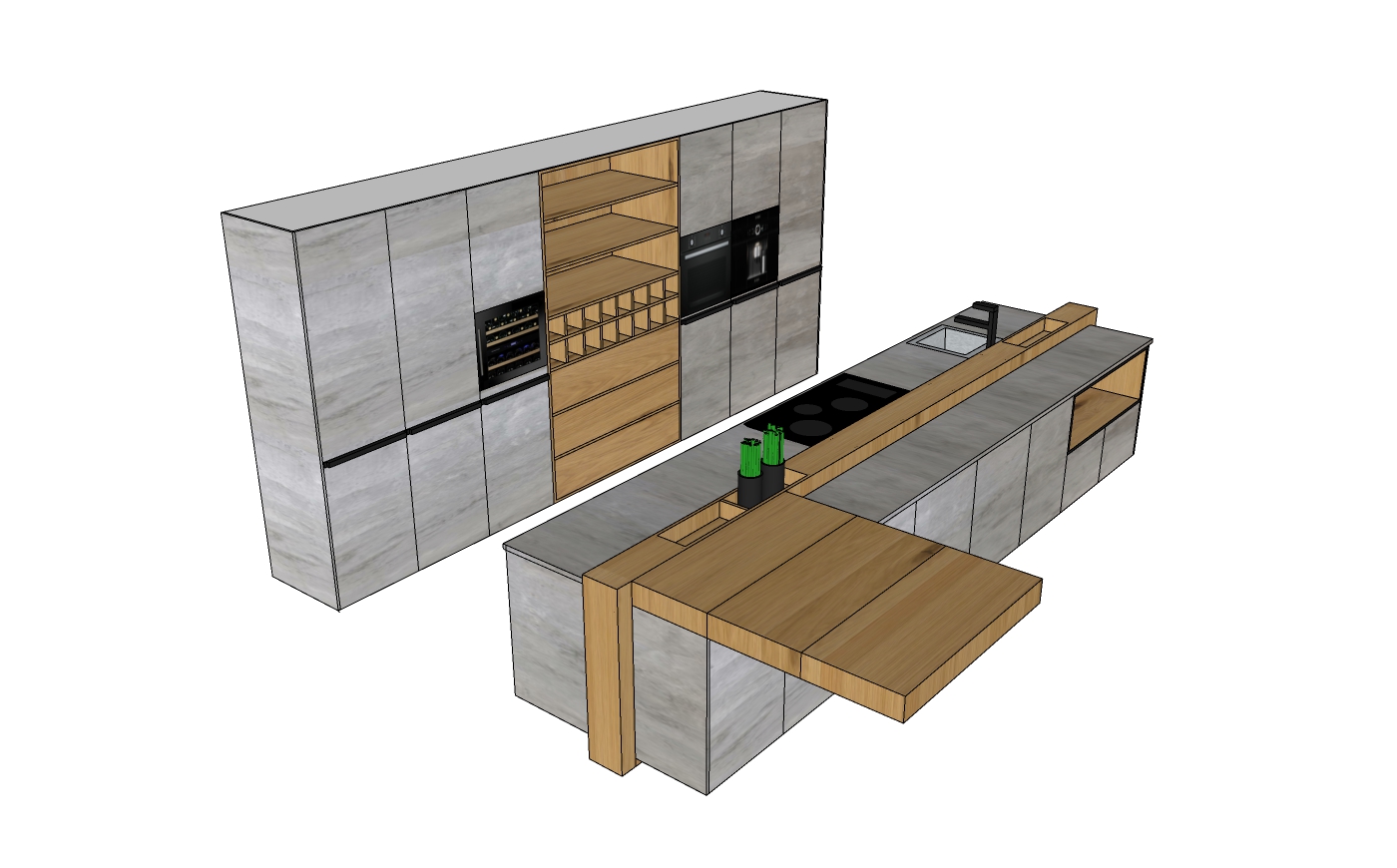 Bộ hình ảnh này thể hiện một thiết kế nội thất nhà bếp tinh tế, tạo điểm nhấn từ sự kết hợp hài hòa giữa vật liệu gỗ và bề mặt acrylic. Bố cục tổng thể bao gồm hai phần chính: hệ thống tủ kệ tích hợp và bàn bếp đa chức năng. Thiết kế này không chỉ hướng đến tính thẩm mỹ mà còn nhấn mạnh vào tính tiện dụng, mang lại trải nghiệm sử dụng tối ưu cho gia chủ.