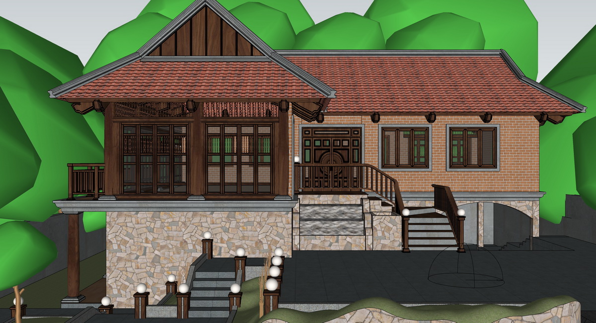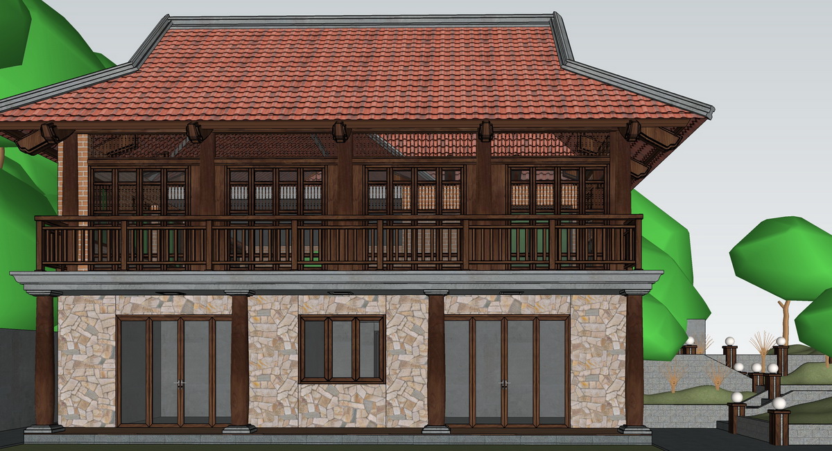 Hình ảnh trình bày một ngôi nhà hai tầng với cấu trúc mái ngói đỏ, các khung cửa và cột nhà làm bằng gỗ tự nhiên. Tầng dưới được ốp đá chắc chắn, tạo cảm giác vững chãi, hòa quyện cùng thiên nhiên xung quanh. Tầng trên có lan can gỗ và các cửa sổ lớn, tạo không gian thoáng đãng và tận dụng tốt ánh sáng tự nhiên.
